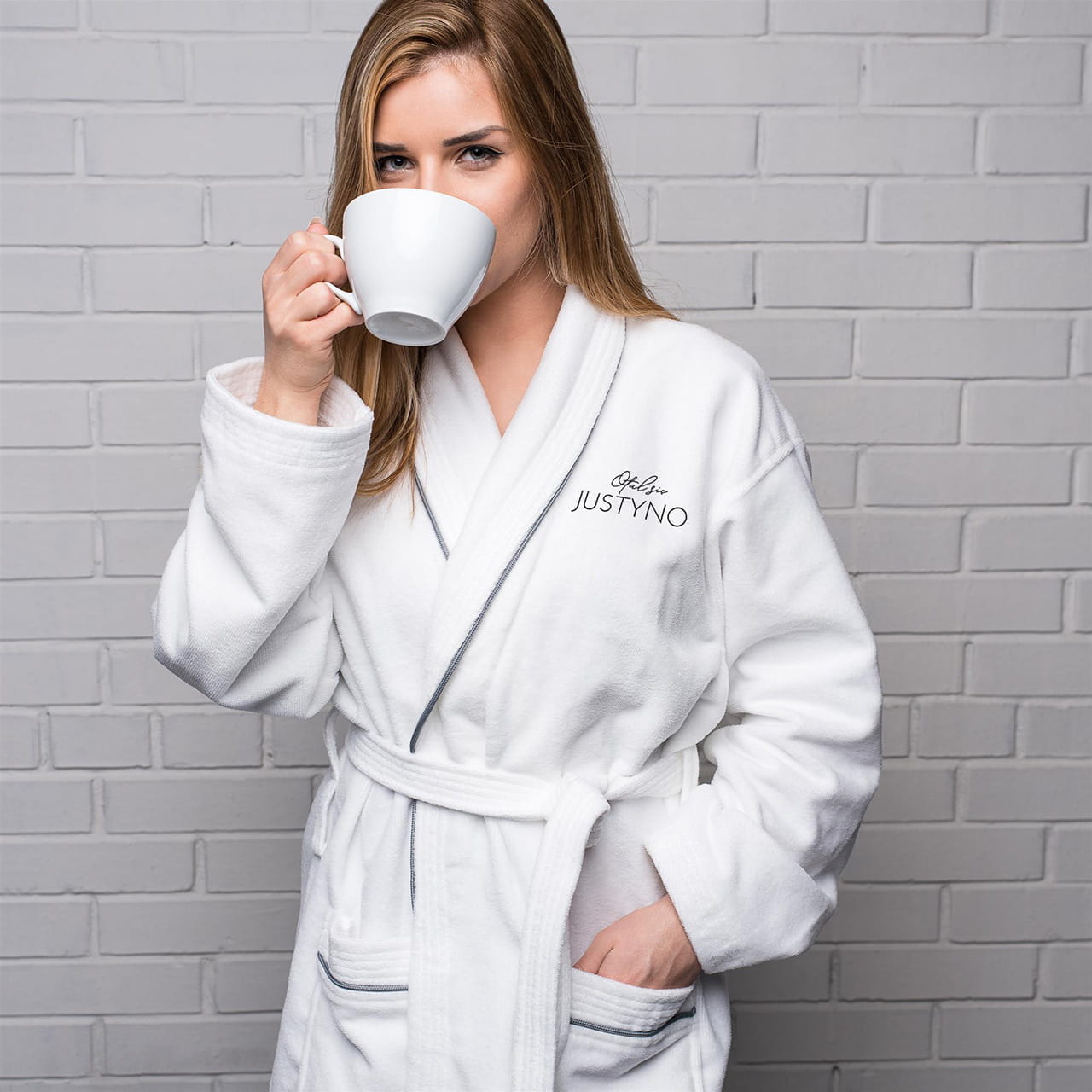 Damski szlafrok z imieniem DLA ZMARZLUCHA dostępny jest w trzech rozmiarach, można więc śmiało wybrać ten najbardziej pasujący. Biały materiał, przewiązanie w pasie i kontrastujący, personalizowany haft – to szlafrok idealny na prezent dla jesieniary!