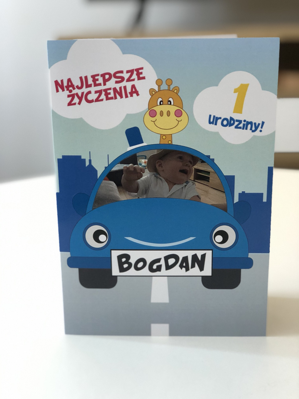 Z tego małego mężczyzny będzie kiedyś świetny kierowca. A może policjant? Strażak? Lekarz? Nikt tego nie wie, ale na pewno wyrasta na wspaniałego człowieka. Kartka urodzinowa dla chłopca ze zdjęciem solenizanta to super pomysł na uzupełnienie głównego prezentu. Osobisty drobiazg zawsze się sprawdza, dlatego personalizowana kartka dla chłopca na pewno nie zawiedzie Twoich oczekiwań. Niebieska kartka urodzinowa dla chłopca zapewni mnóstwo radości w sercach wszystkich domowników.