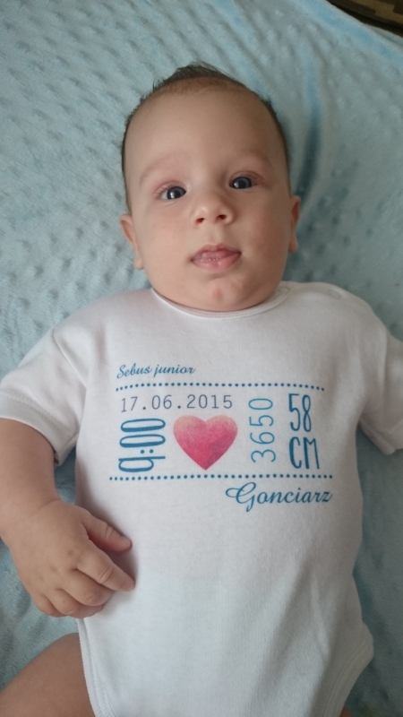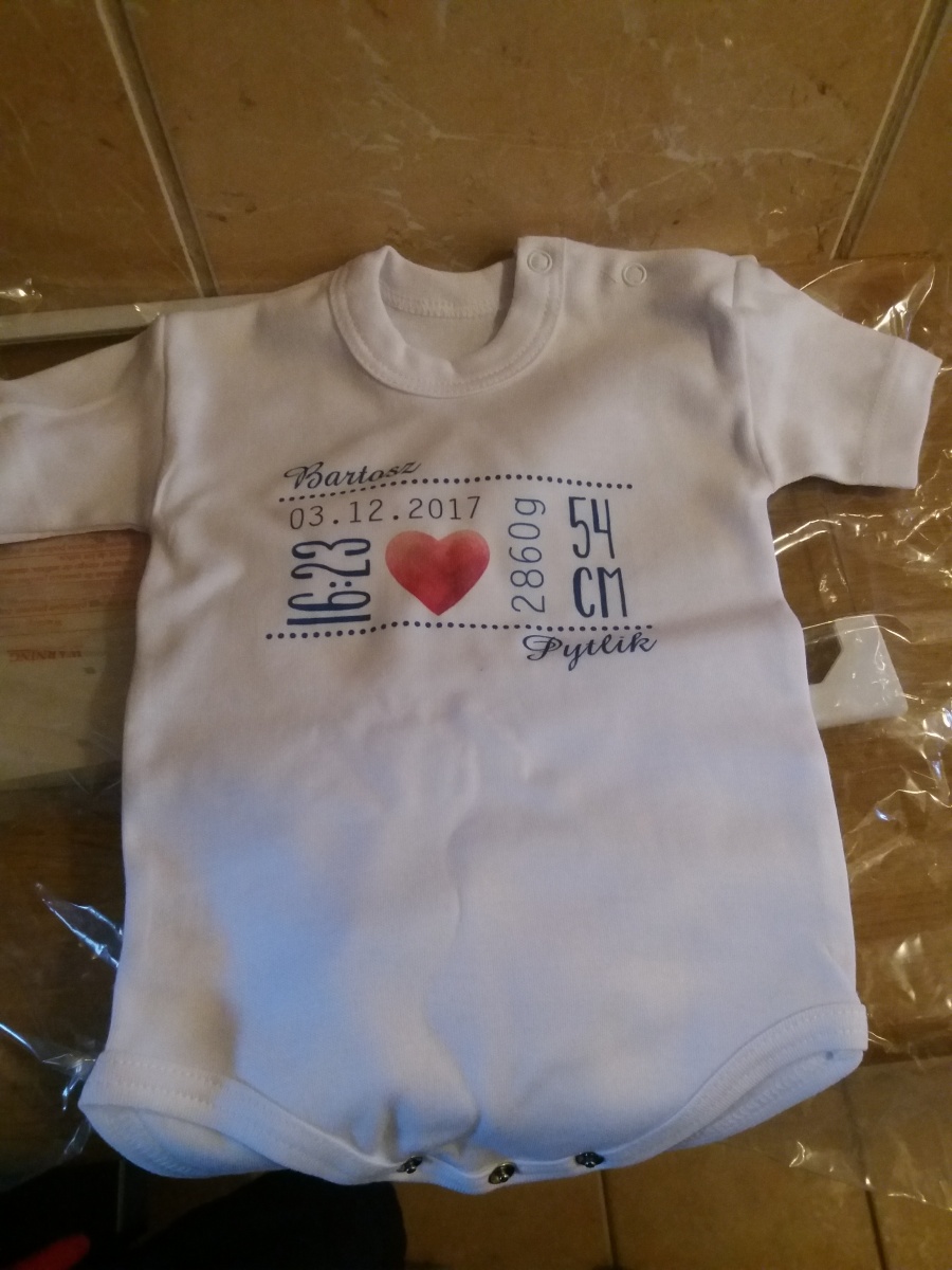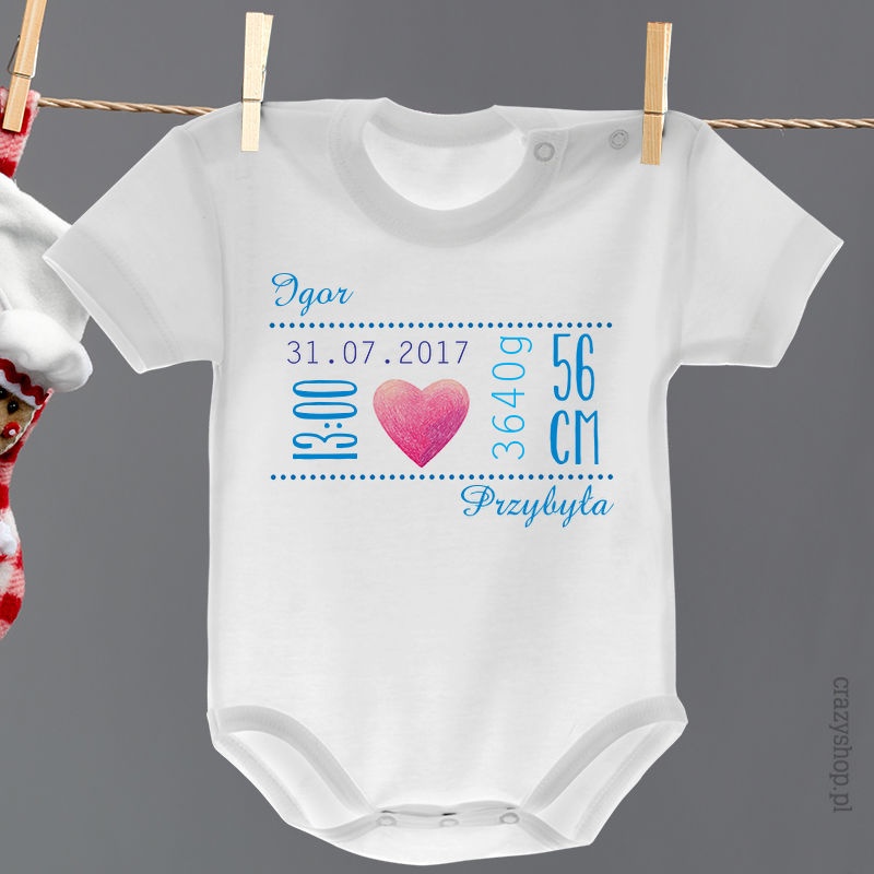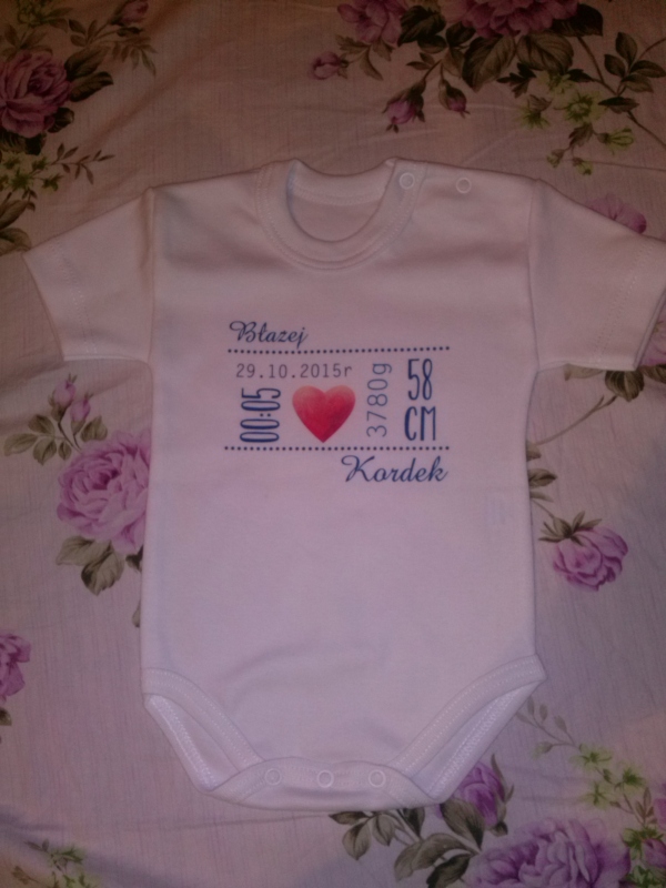 Urokliwe body z metryczką to prezent na narodziny chłopca, który skradnie serca wszystkich domowników. Bezpieczeństwo, wygoda i komfort to ważne elementy udanego upominku dla maluszka. Jeśli do tego wszystkiego dodamy użyteczność przedmiotu i pamiątkowy akcent wówczas otrzymamy najlepszą propozycję na prezent na narodziny chłopca. Białe body z metryczką i serduszkiem na materiale to piękne uwiecznienie najważniejszych informacji w dniu narodzin dziecka.