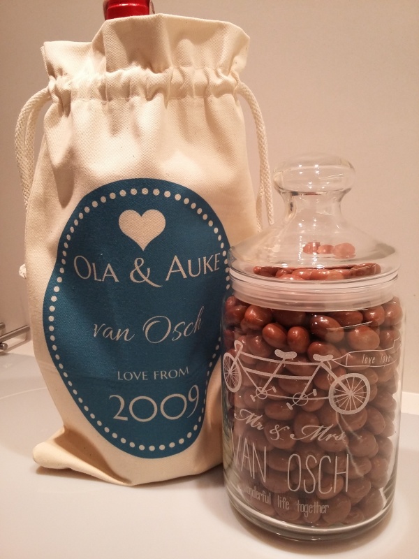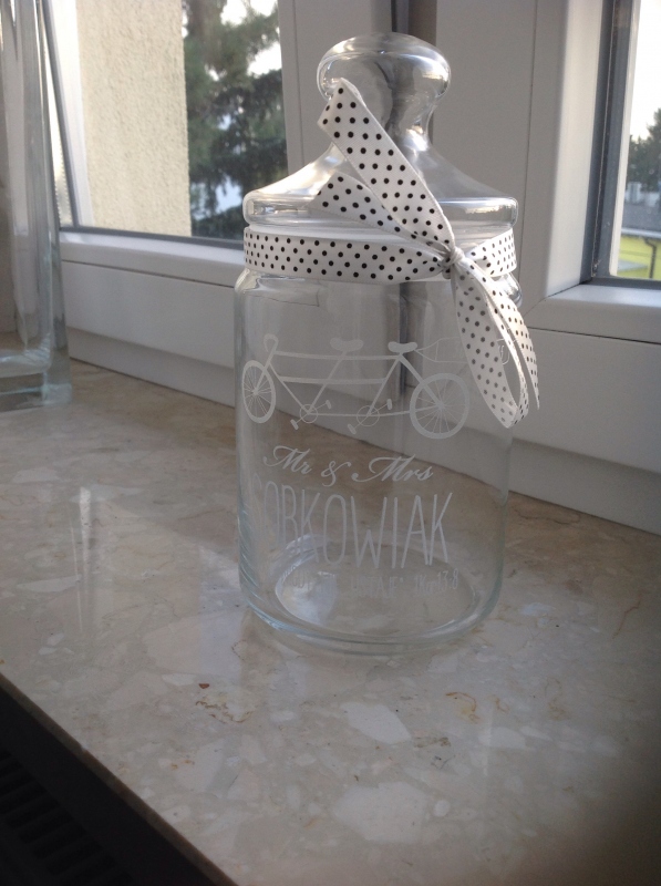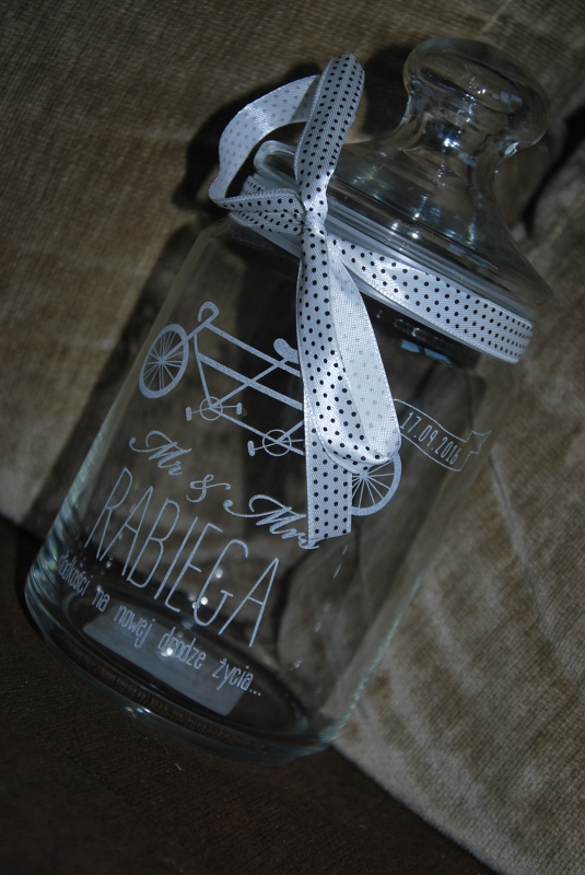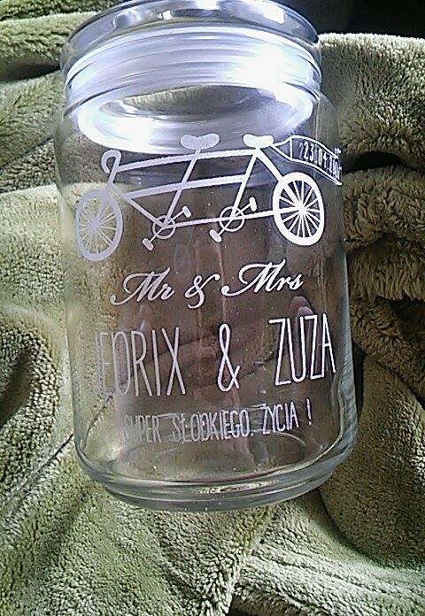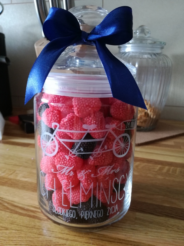 Słoik z tandemem kupiłam już drugi raz jako prezent ślubny. On nie jest duży, 1l, ale zmieściły się do środka 3 paczki cukierków (typu krówki). Wstążeczką dołączona, bezpiecznie zapakowane w przesyłce