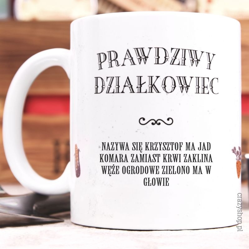 Kubek ze śmiesznym nadrukiem, który możesz spersonalizować, z pewnością zrobi ogromną przyjemność obdarowanej osobie. Podaruj go jako prezent dla działkowca swojemu tacie, dziadkowi czy mężowi.