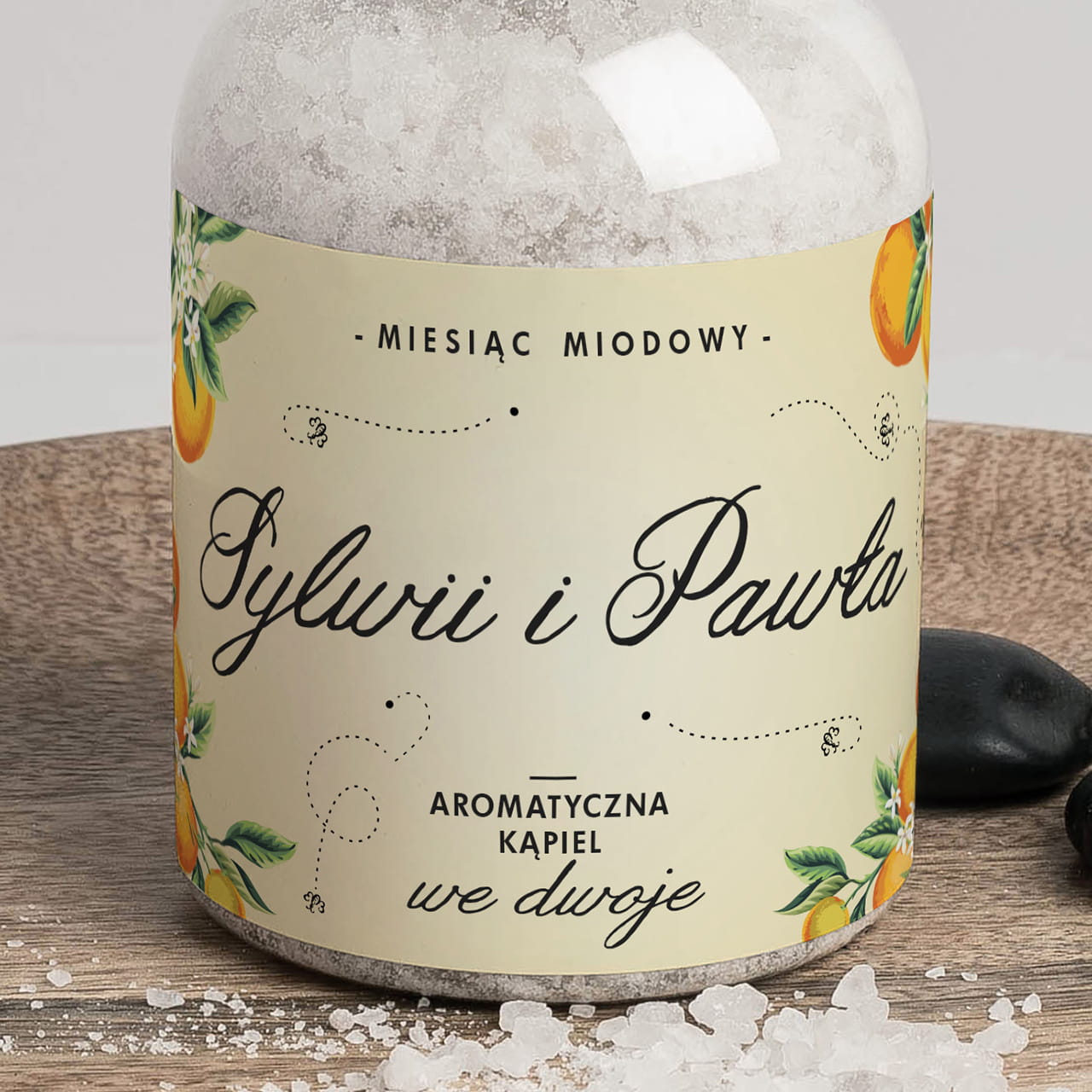 Relaks w oparach miłości to główny cel miesiąca miodowego. A z oparami miłości świetnie współgrają kojące zapachy pomarańczy, uwalniane w czasie romantycznej kąpieli we dwoje. Wzorowy upominek ślubny ma zbliżać do siebie nowożeńców, dlatego kąpielowa sól z dedykacją i sugestią jest idealna na tę okazję.