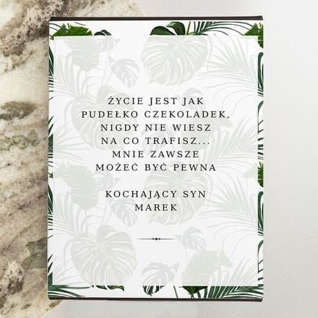 Czekoladki z belgijskiej czekolady PREZENT DLA MAMY NA URODZINY Szukasz wyjątkowego i eleganckiego prezentu, który ucieszy Twoją mamę? Czekoladki z belgijskiej czekolady w pięknym, personalizowanym opakowaniu to propozycja, która łączy smak i emocje. Stylowy projekt z liśćmi i złotym akcentem świetnie sprawdzi się jako dodatek do kwiatów lub główny prezent. Dlaczego takie czekoladki dla mamy to idealny wybór? Możliwość dodania imienia oraz życzeń Pyszne praliny z wysokiej jakości belgijskiej czekolady Gotowy do wręczenia prezent dla mamy na urodziny - nie wymaga dodatkowego pakowania Subtelna, elegancka grafika idealna dla kobiet w każdym wieku Sprawdzi się na urodziny, imieniny, Dzień Matki lub jako słodki gest bez okazji Czekoladki z belgijskiej czekolady to nie tylko słodki upominek, ale też sposób na powiedzenie "dziękuję" i "kocham Cię" w wyjątkowej formie. Idealne, gdy chcesz sprawić mamie chwilę radości, relaksu i odrobiny luksusu. To prezent na urodziny dla mamy, który łączy smak z sercem. Bo każda mama zasługuje na coś naprawdę wyjątkowego.