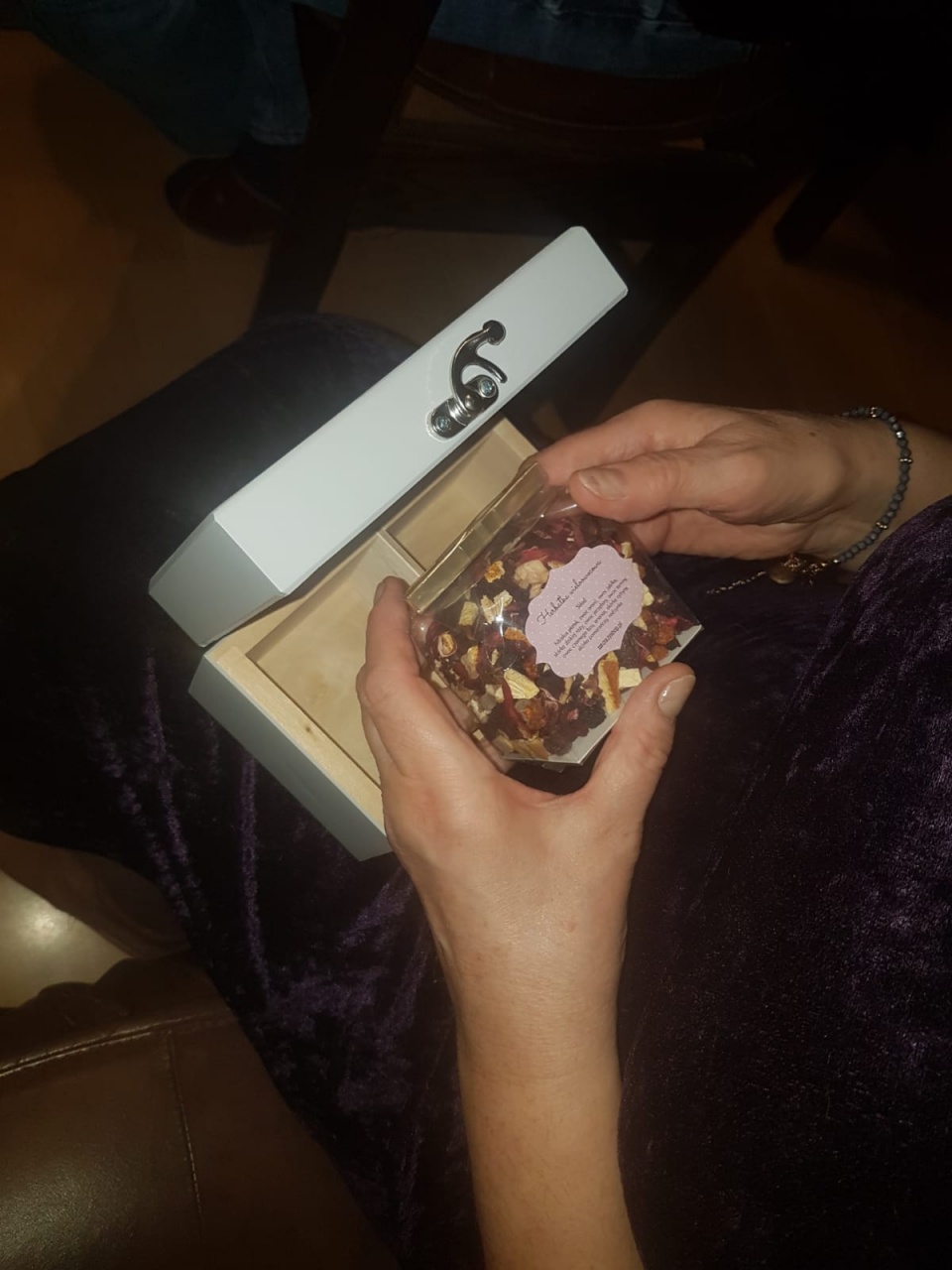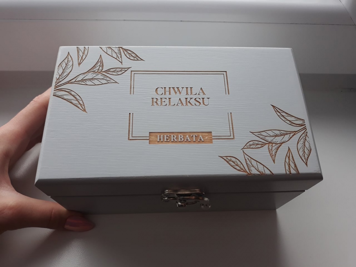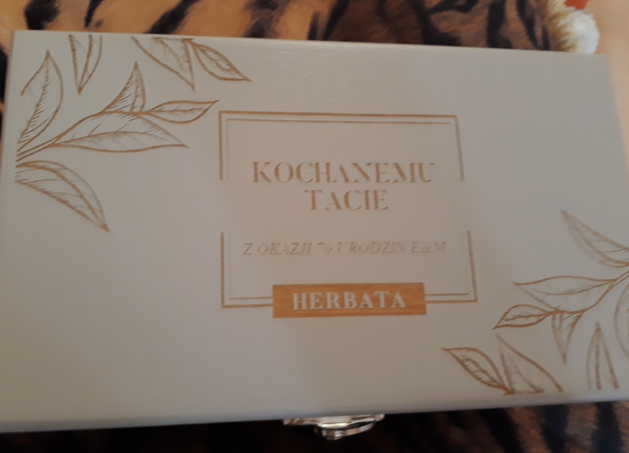 W skład zestawu wchodzi: herbata samo zdrowie, herbata wieloowocowa, skrzyneczka drewniana