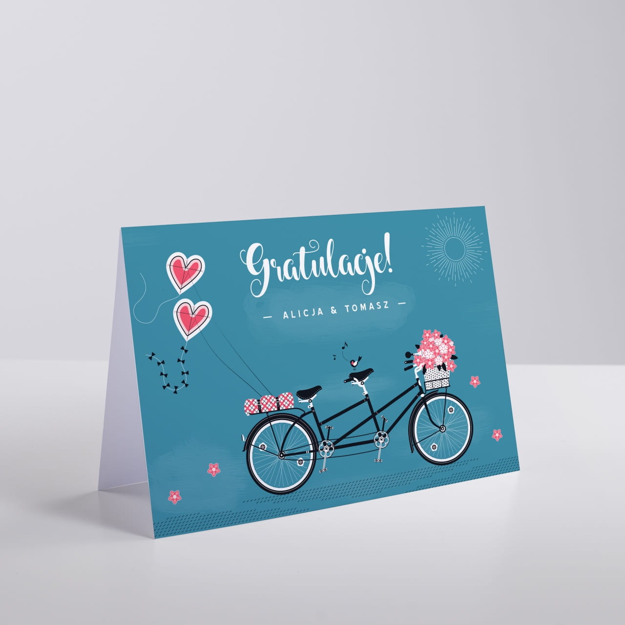 Ta urocza kartka ślubna personalizowana z motywem tandemu to wyjątkowy sposób na wyrażenie szczerych życzeń dla nowożeńców! Przedstawiając radosny motyw roweru tandemowego, który symbolizuje ich wspólne życiowe podróże i przygody, ta kartka emanuje radością i miłością. Otwierając kartkę, otwierasz drzwi do świata pełnego miłości i harmonii, w którym nowożeńcy będą podróżować przez życie razem. Wnętrze kryje miejsce na Twoje osobiste słowa i życzenia, które dotrą do serca obdarowanych, jak delikatny szum wiatru podczas romantycznej przejażdżki rowerem. Dodając nutkę personalizacji, możesz sprawić, że ta kartka stanie się jeszcze bardziej wyjątkowym prezentem, dodając jej uroku i osobistego akcentu. Wykonana z najwyższej jakości materiałów, ta kartka nie tylko prezentuje się elegancko, ale także jest trwała, co sprawia, że będzie cenioną pamiątką z tego wyjątkowego dnia. Niech ta kartka ślubna personalizowana z motywem tandemu będzie wyrazem Twojej miłości i wsparcia dla nowożeńców, dodając uroku i radości w dniu ich szczęśliwego połączenia. To nie tylko kartka - to wyraz szczerych życzeń i najlepszych życzeń na ich wspólną drogę życia!