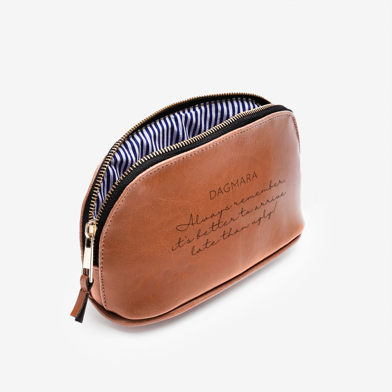 Znasz kogoś, kto zawsze się spóźnia, ale za to wygląda perfekcyjnie? Skórzana kosmetyczka na kosmetyki SPÓŹNIENIE to świetny sposób, by to urocze spóźnialstwo obrócić w żart. Cytat "It's better to arrive late than ugly!" wywołuje uśmiech i od razu zdradza priorytety właścicielki. Grawer z imieniem dodaje osobistego charakteru, a elegancki wygląd sprawia, że kosmetyczka pasuje do każdej torebki.