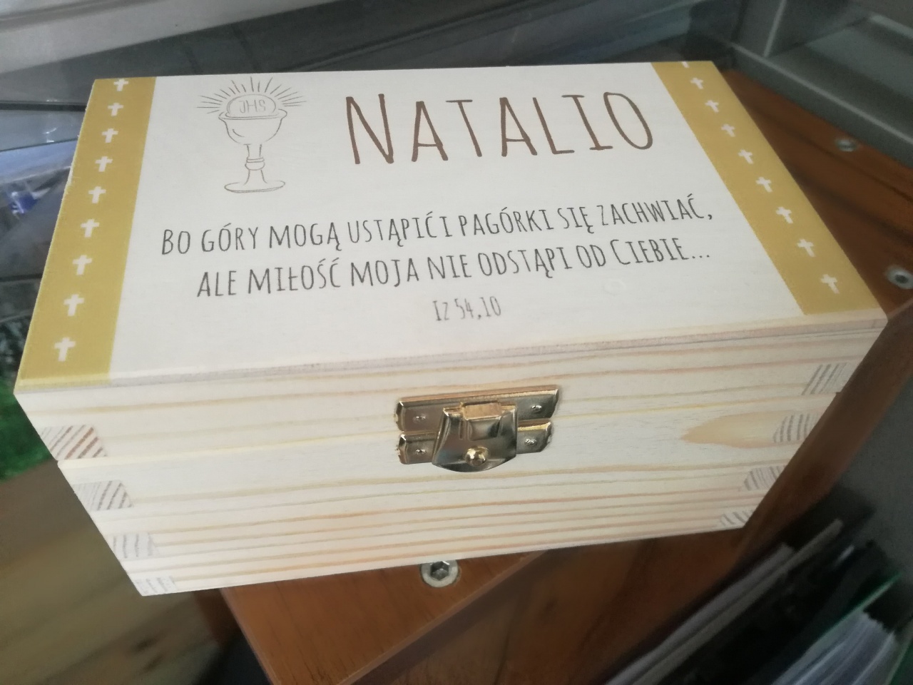 Poszukujesz pięknie prezentującego się a zarazem przydatnego podarunku na prezent dla chrześnicy na komunię? Spodoba Ci się nasza skrzyneczka na drobiazgi. To wyjątkowo praktyczny prezent na komunię dla dziewczynki. Wykonano ją z pięknego drewna sosnowego, na którym nadrukowano sentencję i religijną grafikę.
