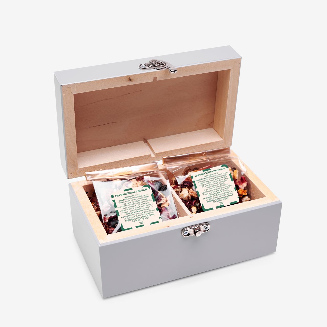 W skład zestawu wchodzi: herbata samo zdrowie, herbata wieloowocowa, skrzyneczka drewniana