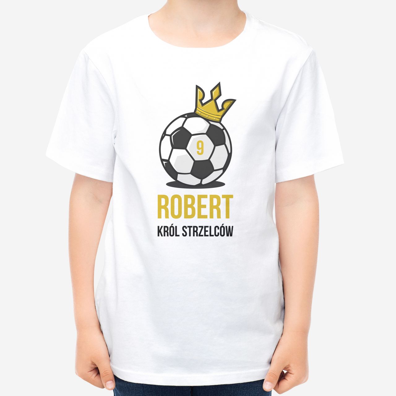 Koszulka dziecięca z nadrukiem KRÓL STRZELCÓW to prezent z okazji urodzin, Dnia Dziecka, Mikołajek lub rozpoczęcia kolejnego piłkarskiego sezonu.