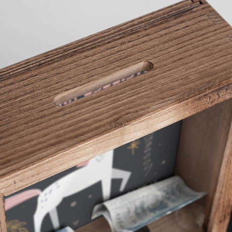 Ładnie wykonana, duża, pojemna skarbonka, tylna szybka wysuwana do góry.