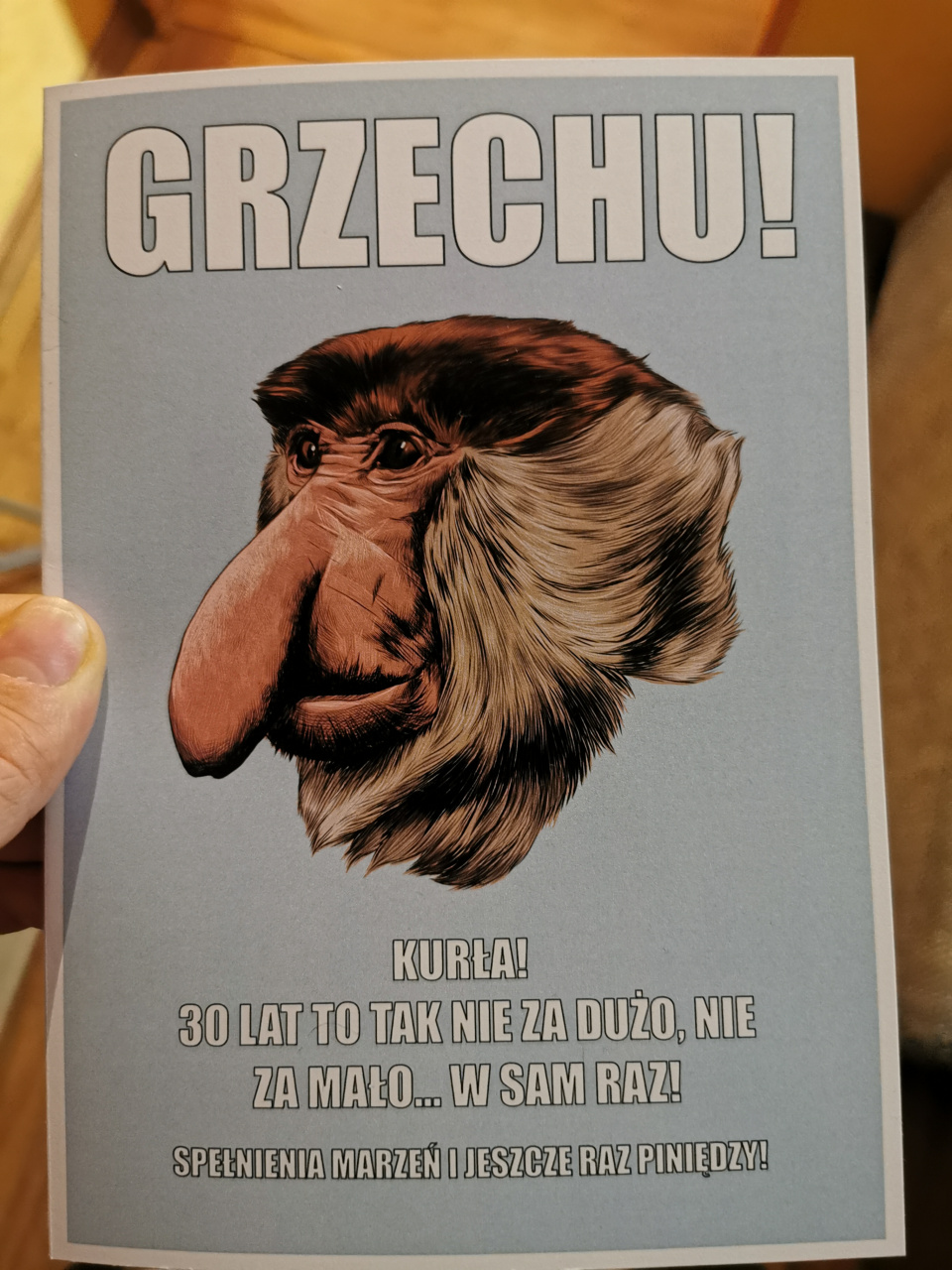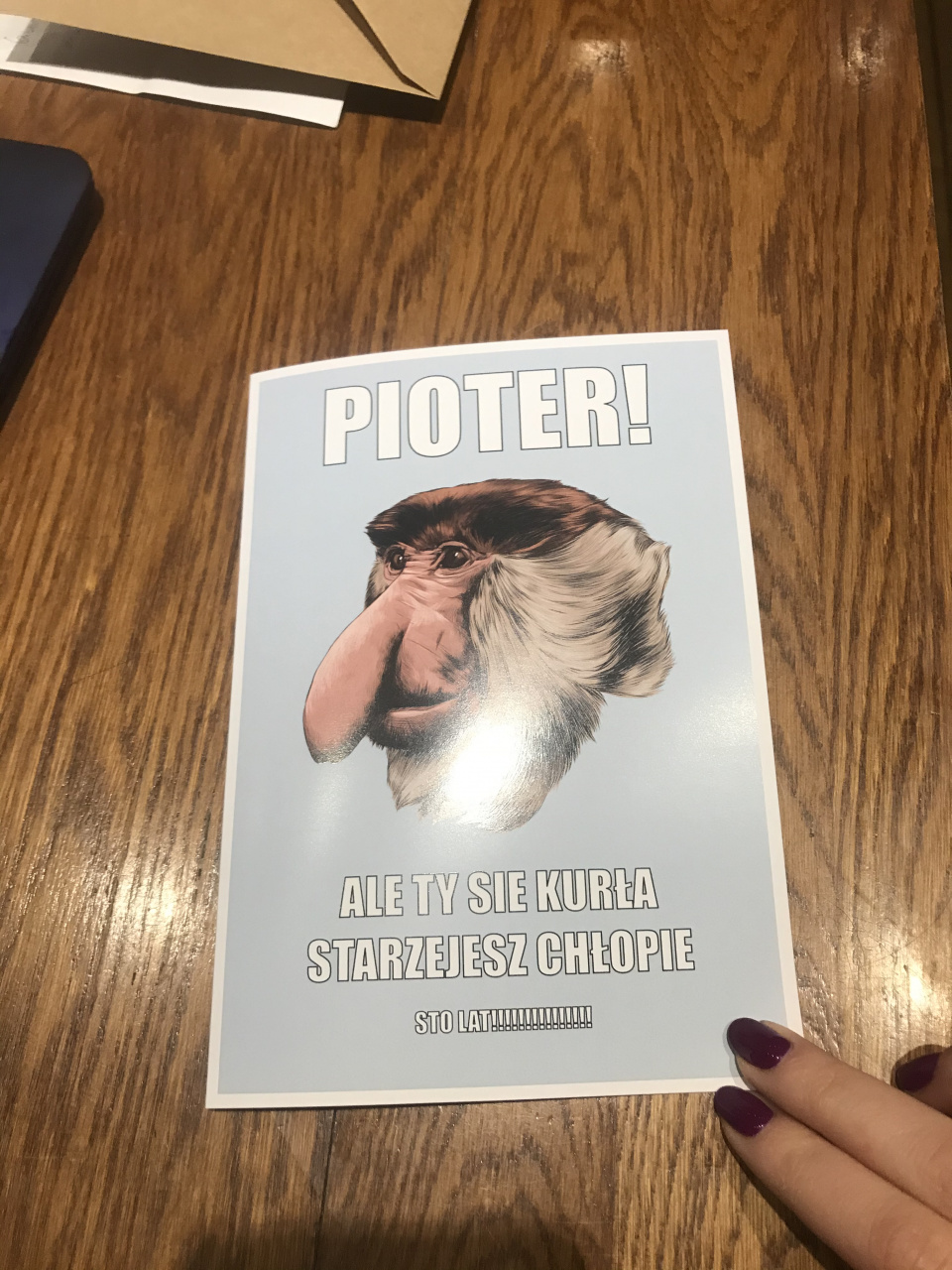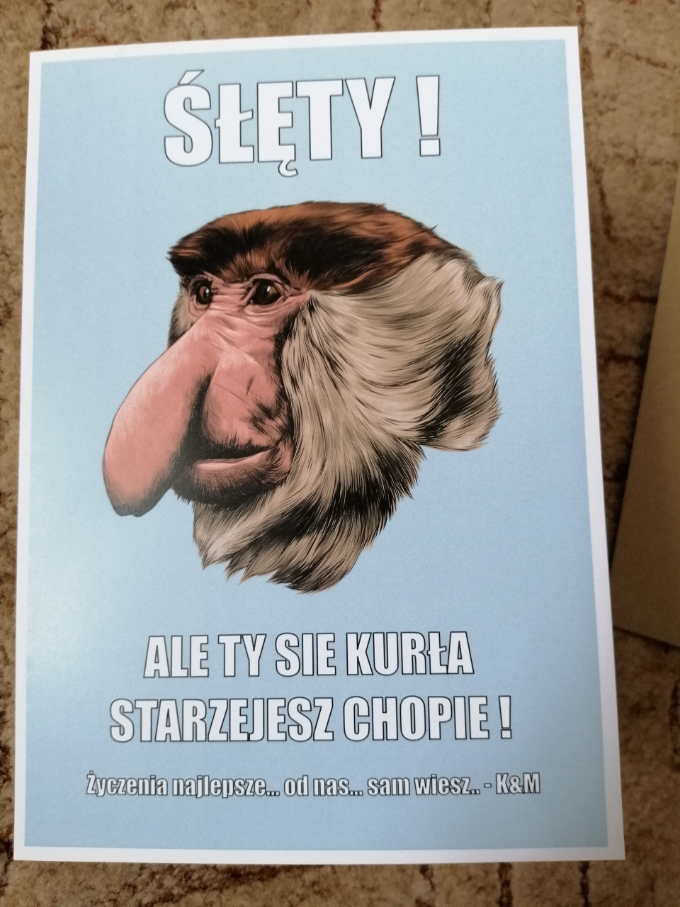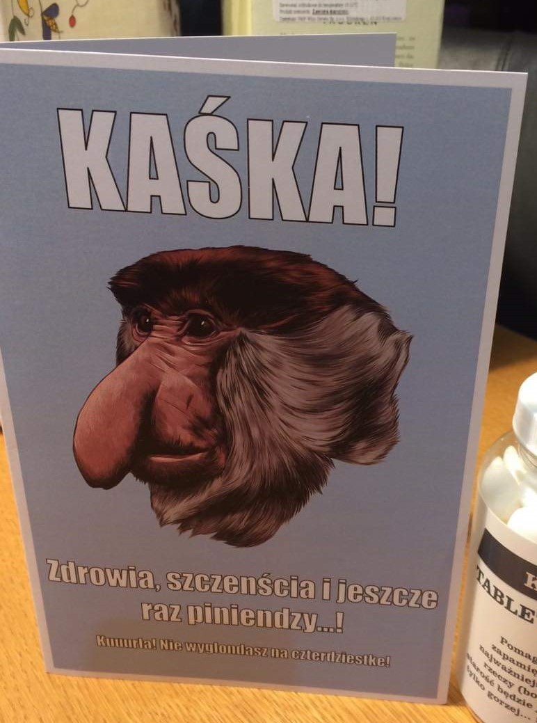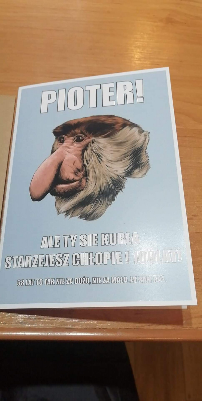 Nosacz podbił rynek! Nic więc dziwnego, że kartka urodzinowa z nosaczem to bardzo chodliwy towar. Śmieszna kartka urodzinowa dołączona do głównego prezentu jest niczym wisienka na torcie. Kartka urodzinowa z nosaczem to zabawny drobiazg dedykowany młodym osobom z poczuciem humoru. Twój kumpel kończy właśnie 18 lat, a może stuknęła mu już okrągła dwudziestka? Nadszedł czas, aby powiedzieć mu dosadnie starzejesz się chłopie i przyjmij to z godnością. Śmieszna kartka urodzinowa z komicznym hasłem na froncie z pewnością rozbawi solenizanta do łez.