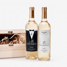 Najczęściej nowożeńcy dostają od gości wino na upominek ślubny. Ale przecież ich jest dwoje i każdy z nich zasługuje na wyróżnienie. Dwa wina w skrzynce to doskonałe rozwiązanie. Tak zestawiony ze sobą duet to prezent ślubny dla pary młodej, który zadowoli zakochanych. Elegancki zestaw win na prezent ślubny to radość dla Niej i dla Niego. Obdarowane osoby będą zaskoczone na widok butelek zaprojektowanych specjalnie dla nowożeńców. Personalizowane etykiety robią naprawdę wrażenie i są piękna pamiątką dla rodziny.