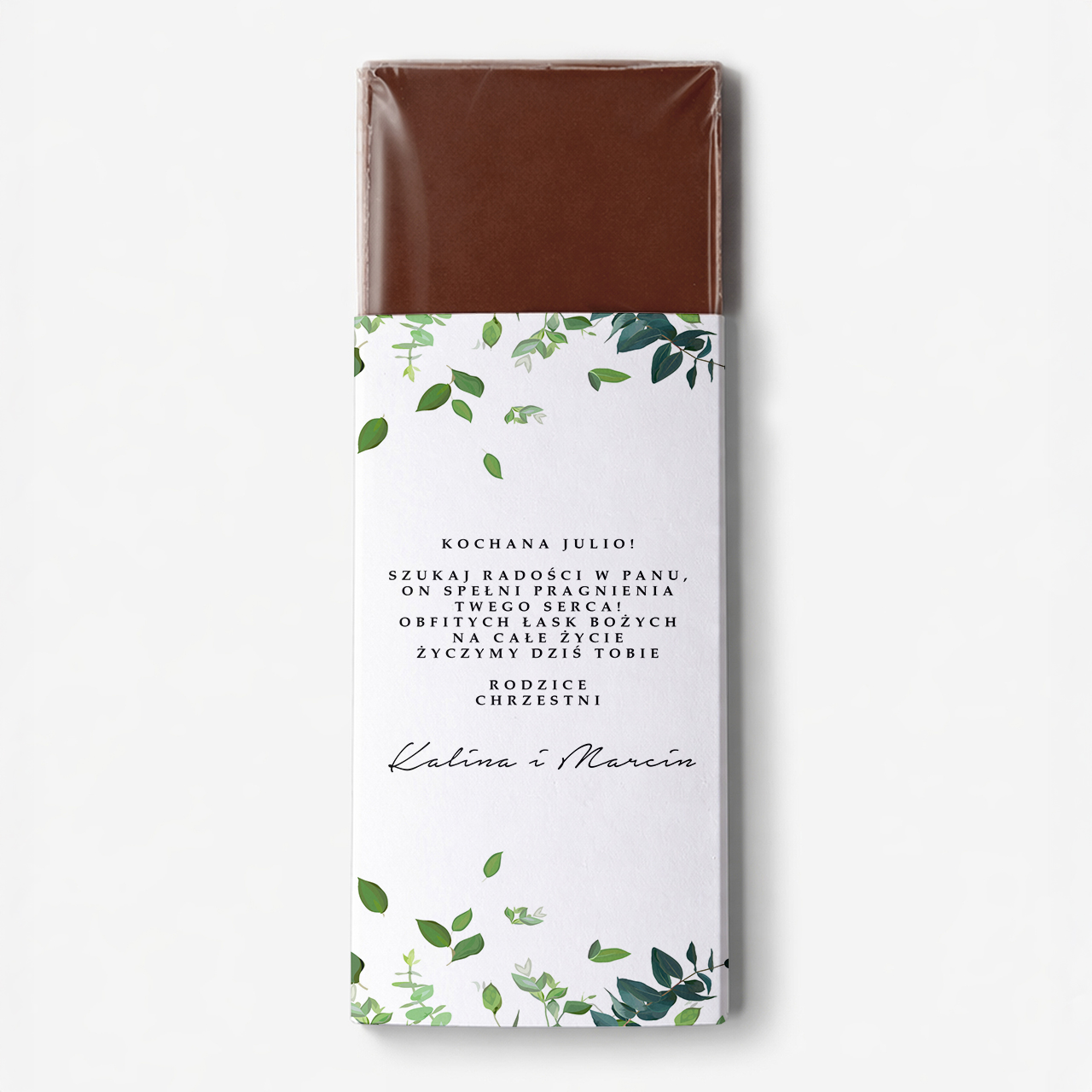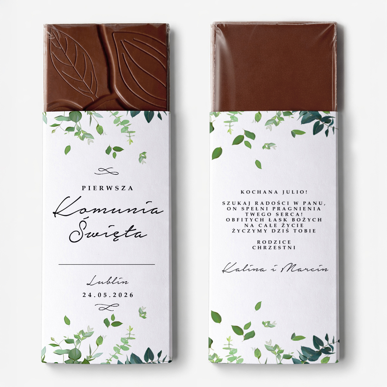 Elegancko zapakowana czekolada na komunię zawsze się sprawdza. Słodka niespodzianka to doskonały dodatek do głównego prezentu na ważną okoliczność. Zadbaj o to, aby dedykacja na kartoniku była trafnym odzwierciedleniem tematyki wydarzenia. Wykonana ręcznie tabliczka belgijskiej czekolady to klasyk uwielbiany przez wszystkich łasuchów szczególnie tych najmłodszych.