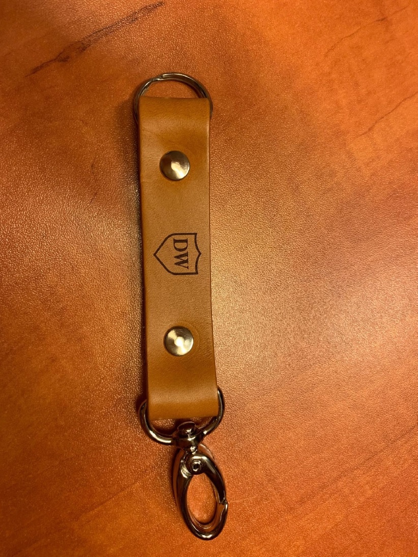 Prezentowany brelok z grawerem to gadżet skierowany do osób, które lubią do codziennego życia dodać szczyptę elegancji i luksusu. Wszystko to za sprawą formy i materiałów wykorzystanych podczas produkcji upominku. Naturalna skóra o koniakowej barwie w połączeniu ze starannie wykonanym karabińczykiem tworzą estetyczne zestawienie. Zadbaliśmy o należyte zabezpieczenie cennych kluczy oraz wygodę podczas ich noszenia.