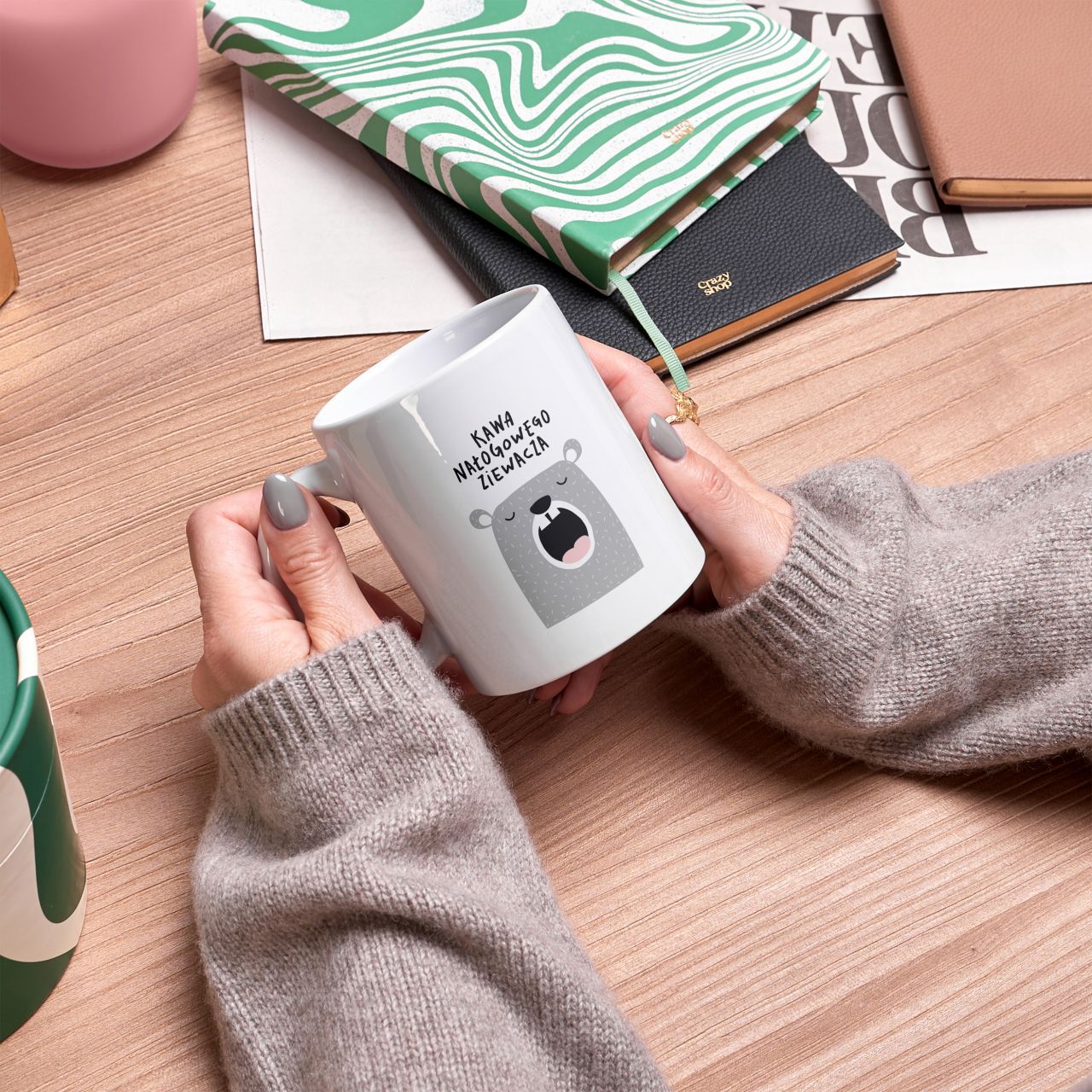Kubek z nadrukiem ZIEWACZ to idealna odpowiedź na Twoje potrzeby - zarówno praktyczne, jak i humorystyczne. Zabawna grafika z ziewającym misiem od razu poprawia nastrój i wywołuje uśmiech. To świetny sposób, by zacząć dzień z przymrużeniem oka.