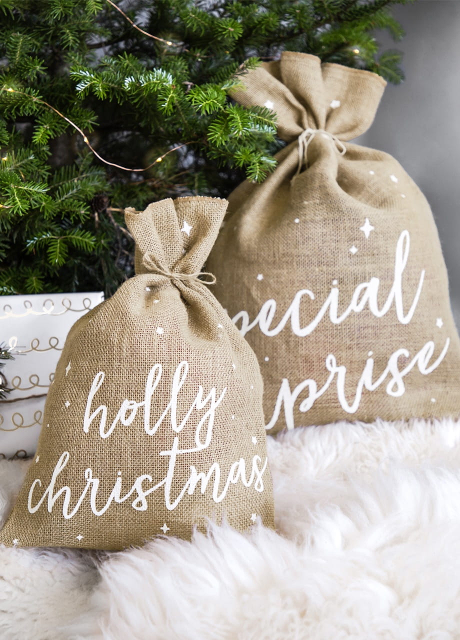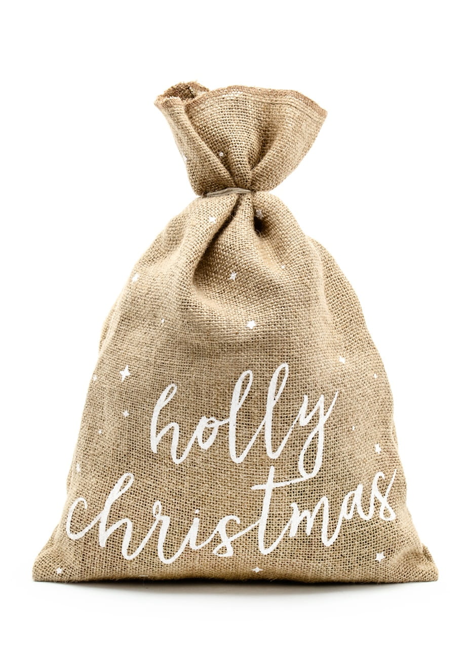 - jutowy worek z białym nadrukiem i napisem Holly Christmas, wiązany na jutowy sznurek