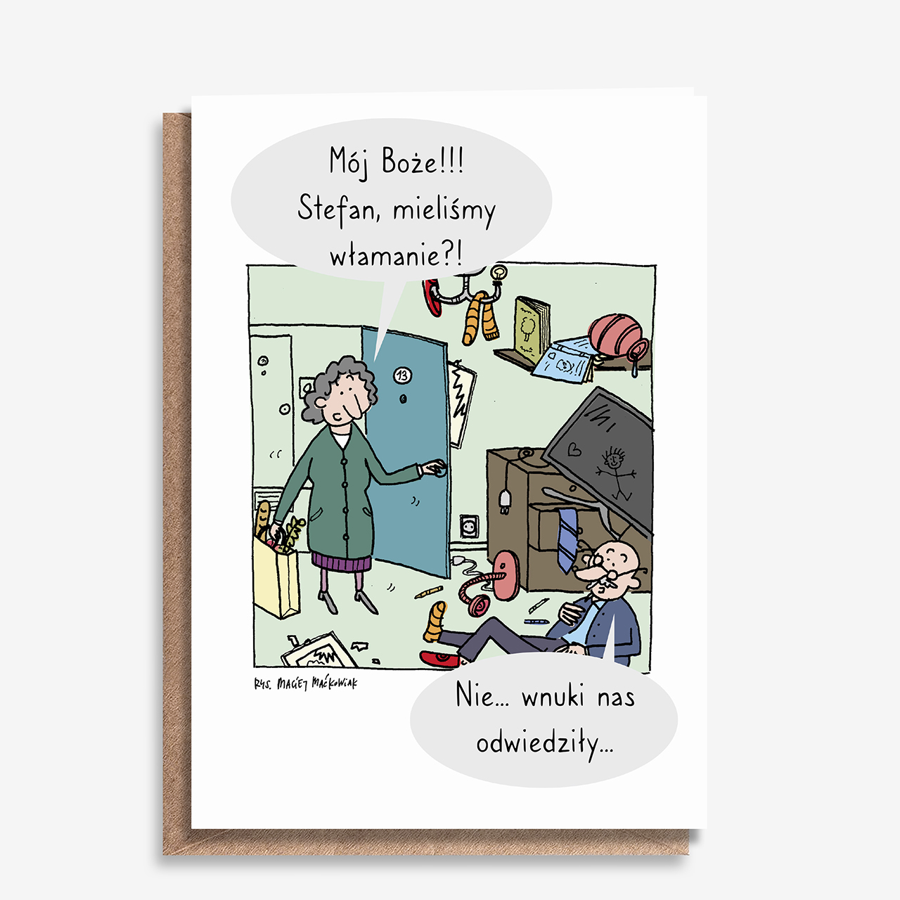 Zabawna kartka dla babci i dziadka MIELIŚMY WŁAMANIE to doskonałe podsumowanie życia u boku z wnukami. Z dzieciakami nie ma mowy o udzie. Mówi się, że z maluchami nie ma czasu na starzenie się i coś w tym jest, bo dziadkowie przy wnukach są przebojowi, energiczni i zawsze gotowi na rozrywkę. W przerwie między szaloną zabawą i przyjmowaniem wnuków na włościach należy im się mała nagroda wyrażająca wielki gest wdzięczności.