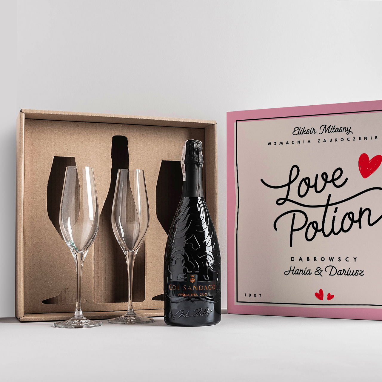 W skład zestawu wchodzą: butelka wina 0,75l, 2 kieliszki, opakowanie tekturowe
