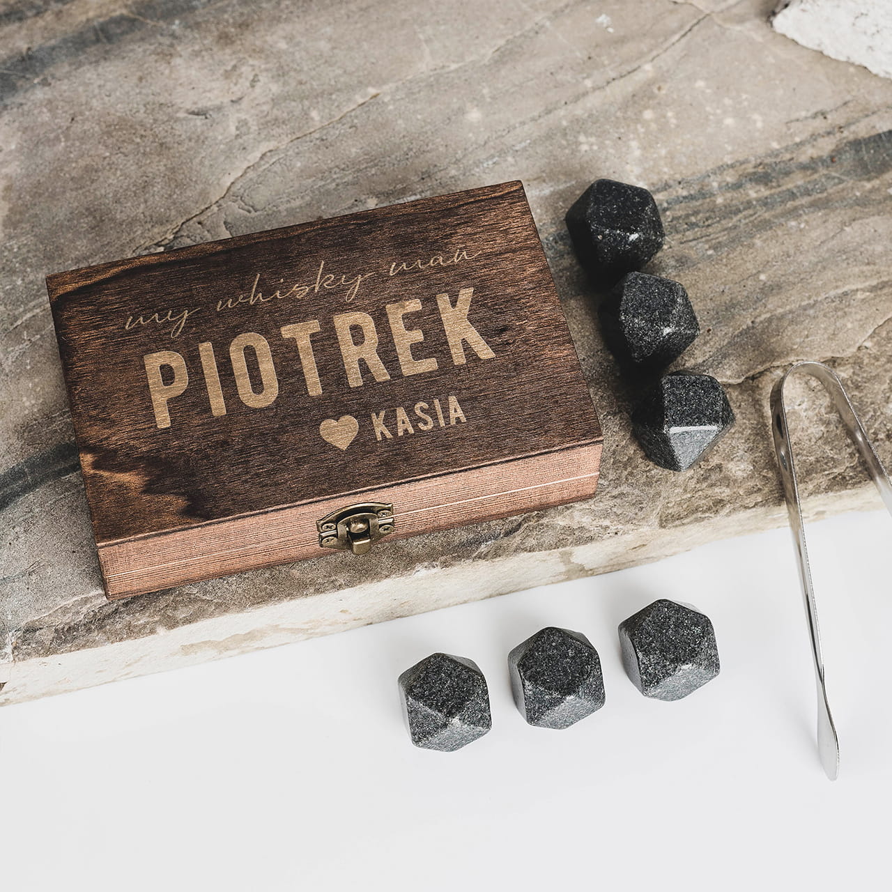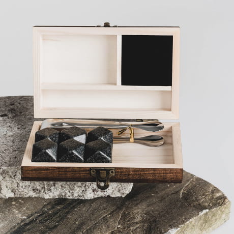 Kamienie do whisky z grawerem to wspaniały pomysł na oryginalny prezent dla narzeczonego na rocznicę.