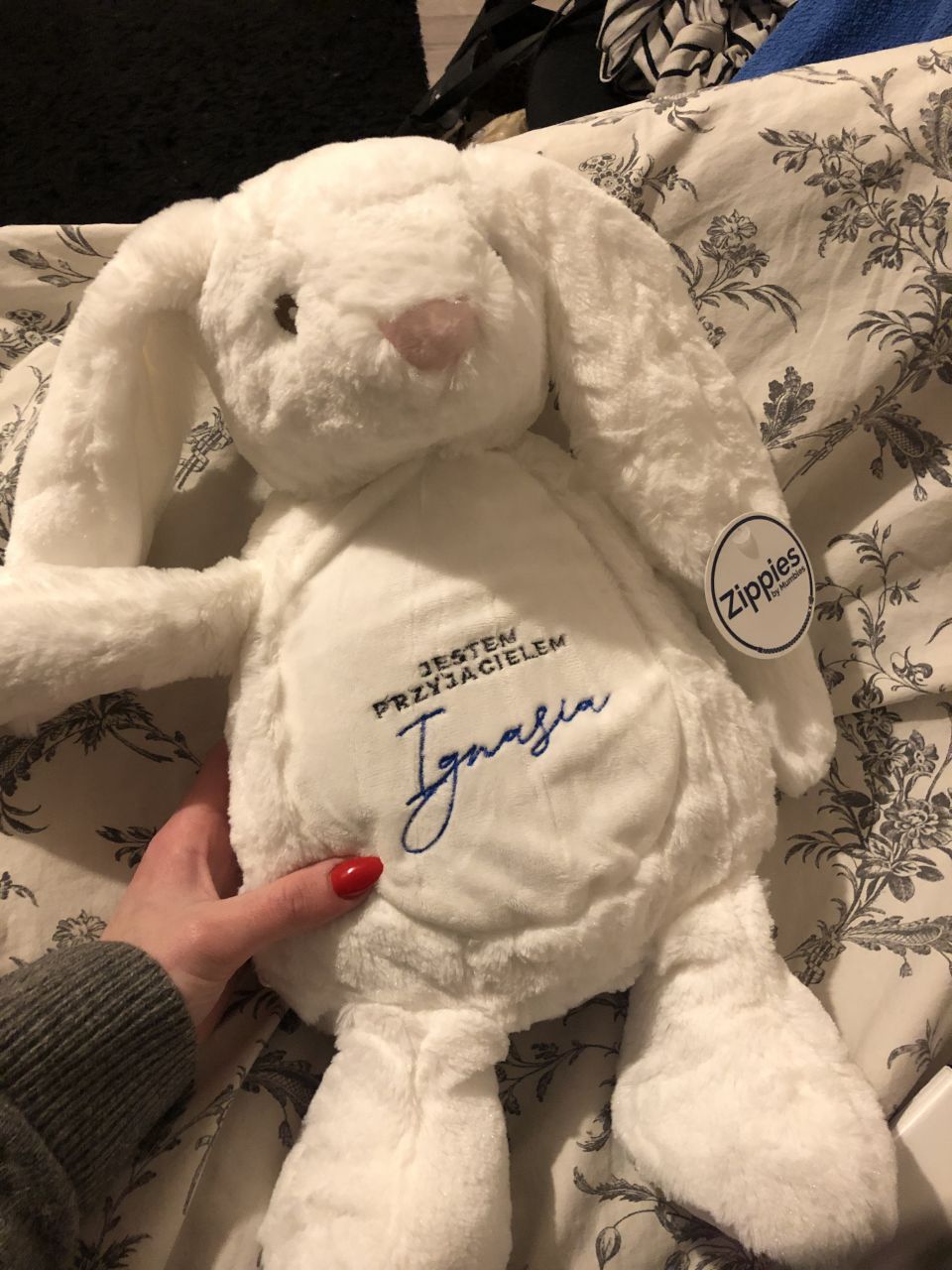 Wystarczy wpisać imię solenizanta, a my umieścimy je na brzuszku przytulanki. Czyim przyjacielem zostanie ten słodki truś? Króliczek maskotka to prezent dla chłopca, który skradnie serce wszystkich domowników. Maskotka z imieniem w klasycznym białym kolorze to również świetny pomysł na personalizowany upominek dla chłopca na chrzest święty.
