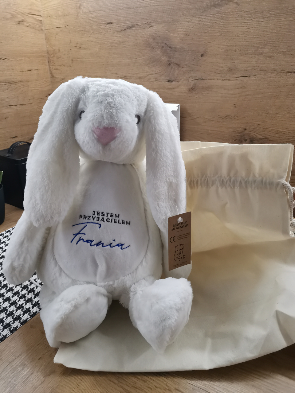 Króliczek maskotka z imieniem PRZYJACIEL to cudowny pomysł na prezent dla chłopca na różne okazje.