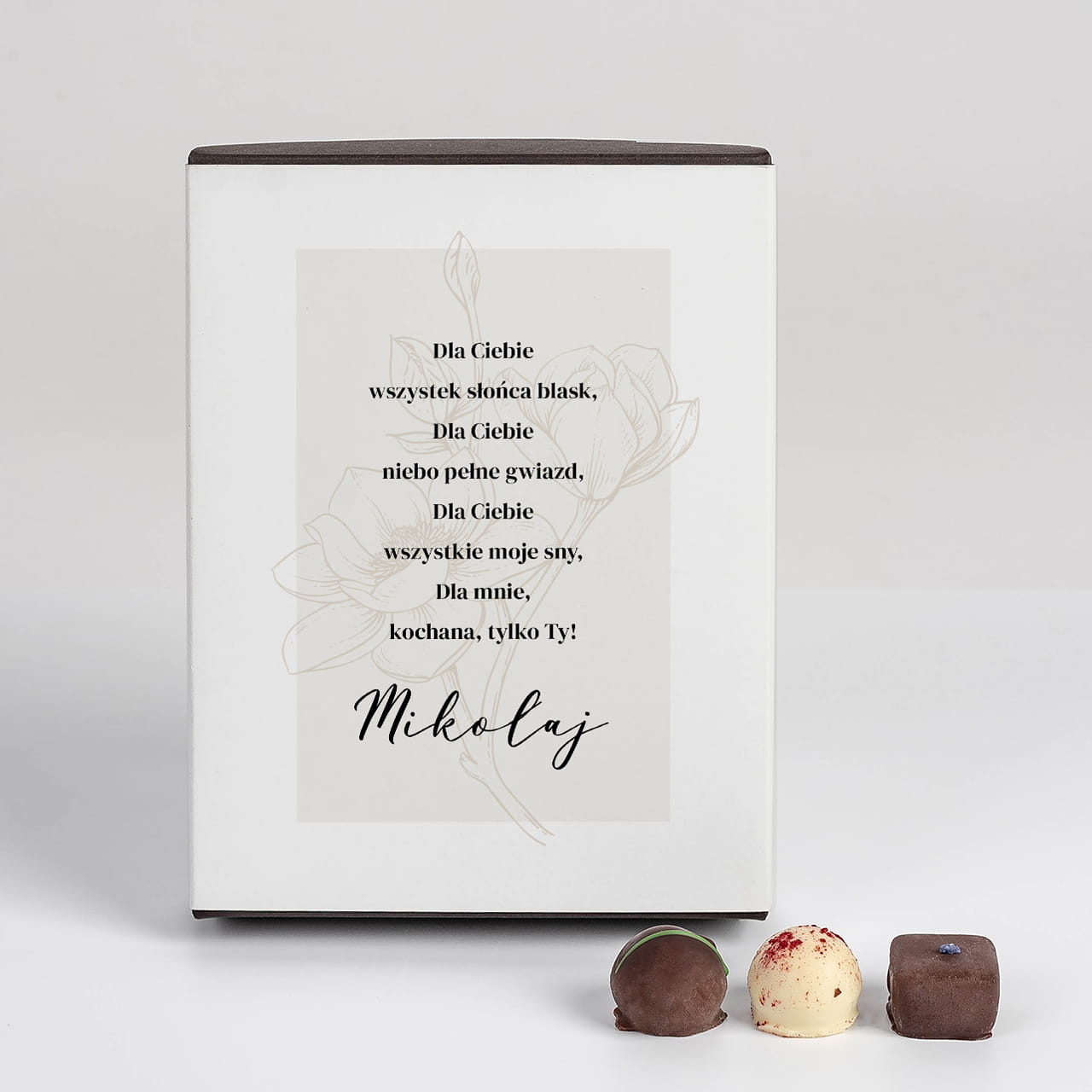 Pralinki na Dzień Kobiet tworzone są z pasją i dbałością o każdy szczegół - od starannie wybranych składników po estetyczne wykończenie. Dzięki temu każda czekoladka staje się słodką chwilą przyjemności. Całość dopełnia opakowanie, które można spersonalizować. Wstaw imię wybranki, kilka słów od siebie oraz ulubioną fotografię. Zaprojektuj piękne pudełko, które będzie wzruszającą pamiątką na długie lata.