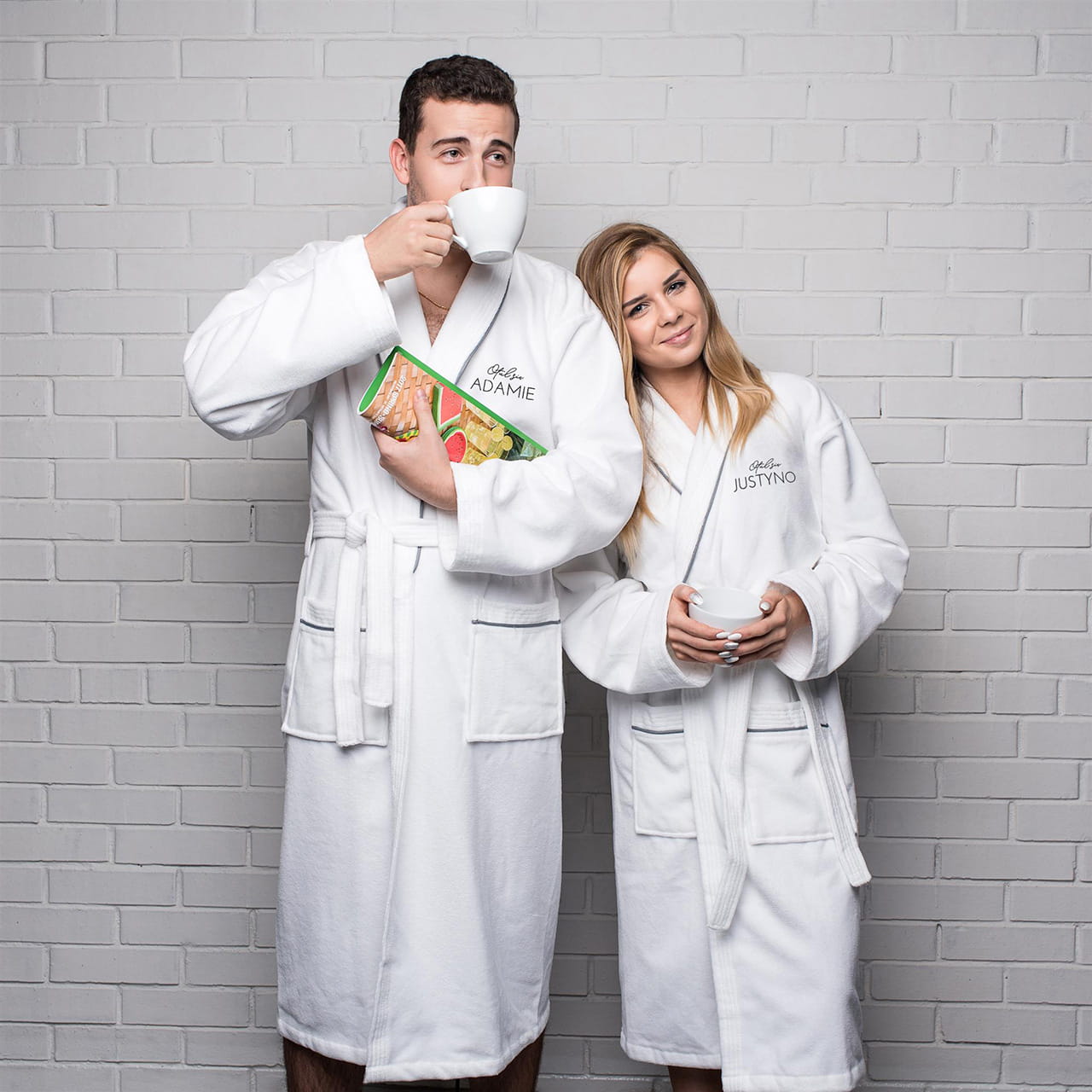 Biały, męski szlafrok z imieniem to doskonała propozycja dla mężczyzny, który ceni sobie ciepło domowego ogniska i wygodę. Idealny na prezent dla chłopaka, męża i przyjaciela. Wykonany z wysokiej jakości materiału męski szlafrok z imieniem posiada eleganckie wykończenia, które nadają całości niepowtarzalnego stylu i szyku. Wybrany przez Ciebie mężczyzna może wykorzystać ciepłą narzutkę podczas ulubionych codziennych rytuałów. Poranny szybki prysznic, relaksująca kąpiel wieczorową porą lub leniwy dzień przed telewizorem. Męski szlafrok z imieniem sprawdzi się w każdej sytuacji.