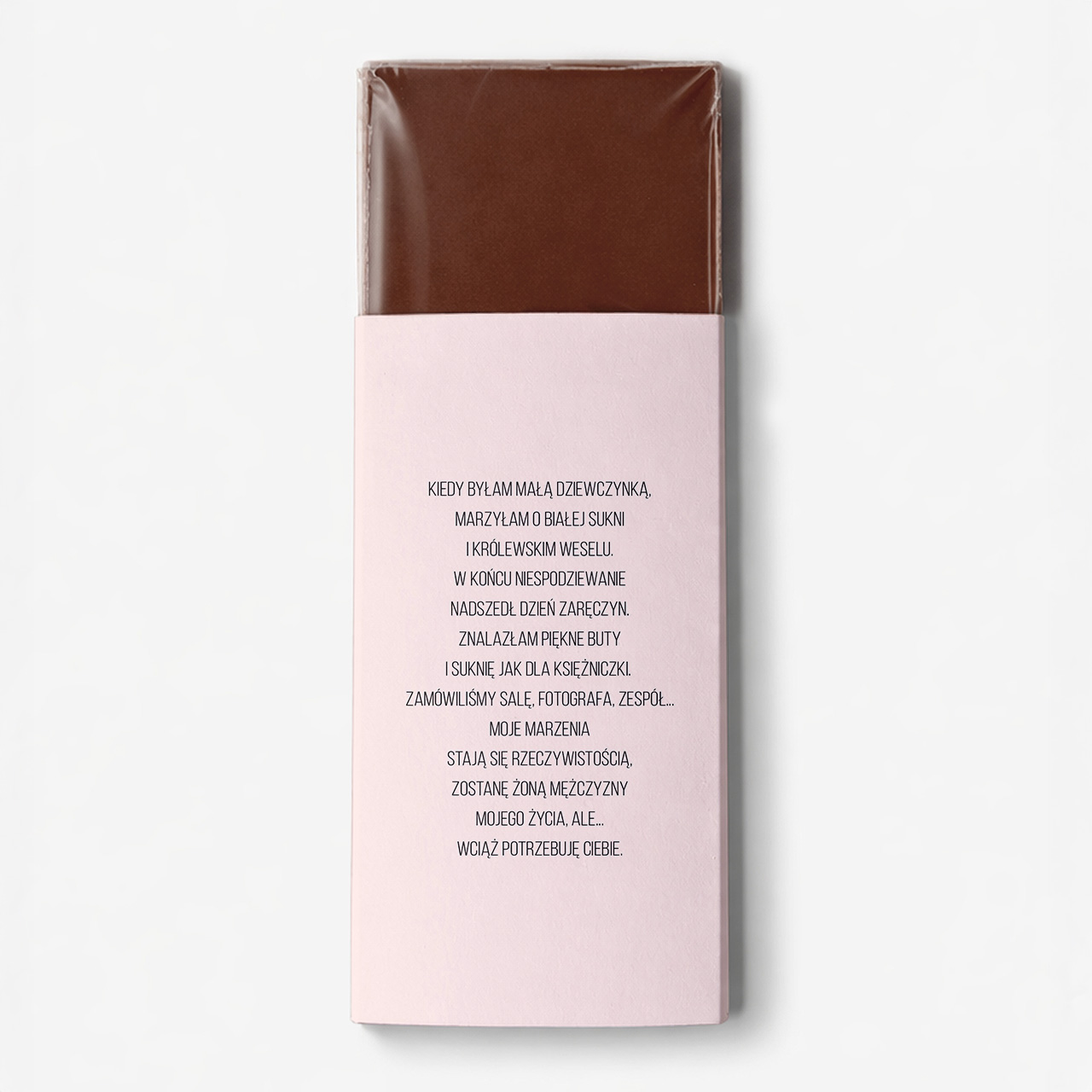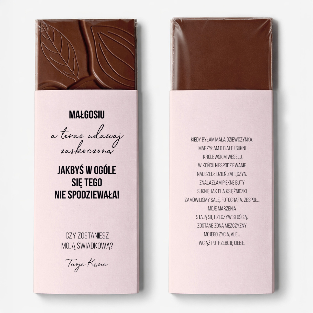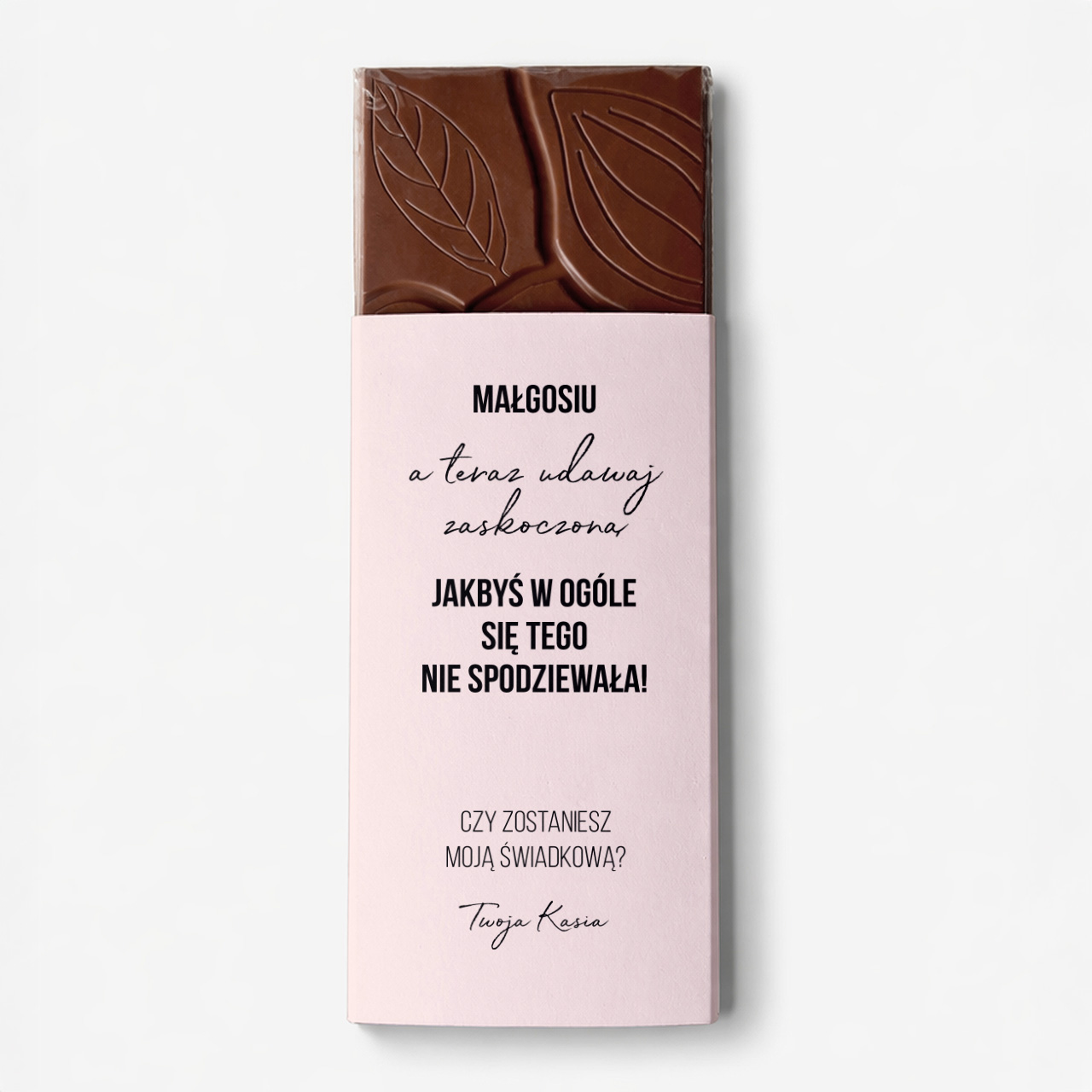 Czekolada z imieniem to niebanalny sposób, by zadać ważne pytanie i jednocześnie wywołać uśmiech. Zamiast zwykłych słów. Słodka niespodzianka z osobistym akcentem. Taki gest z pewnością wzruszy i zostanie zapamiętany na długo jako wyjątkowy moment w przygotowaniach do ślubu.
