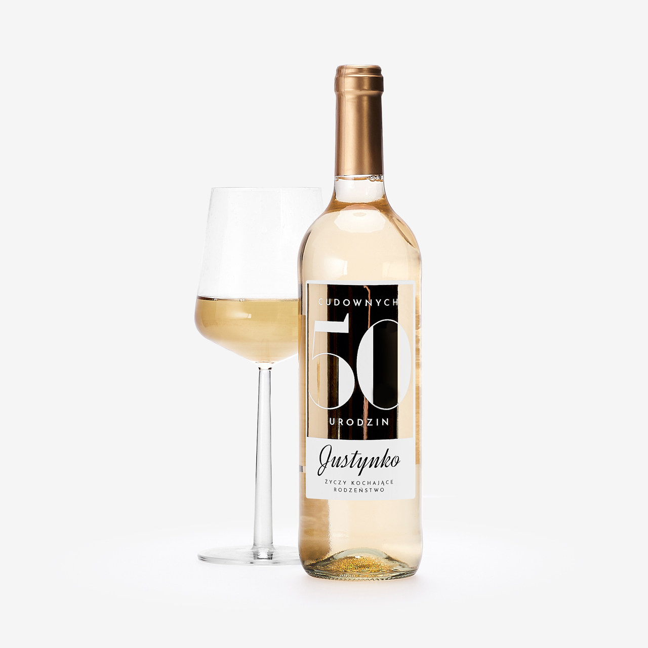 Białe wino na 50 urodziny z personalizowaną złotą etykietą to idealny prezent urodzinowy dla teściowej, siostry lub koleżanki.