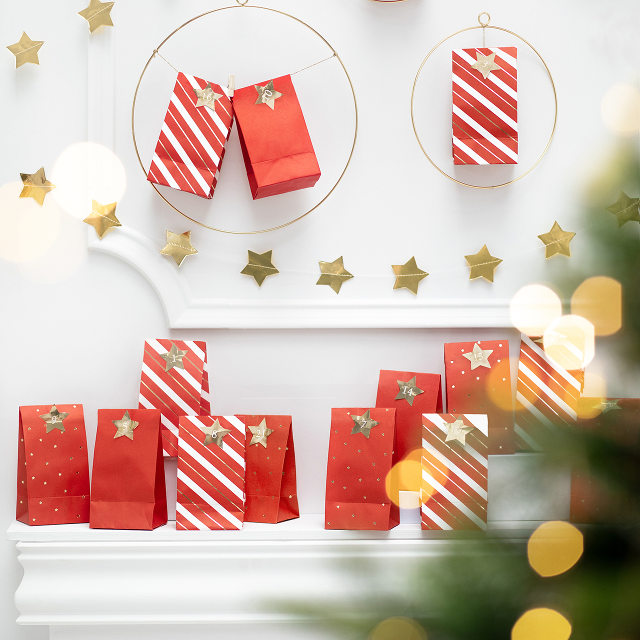 Gotowe kalendarze adwentowe z czekoladkami w środku powoli schodzą na dalszy plan. Wiele osób stawia na kreatywność i własne pomysły. Jeśli i Ty postanowiłeś wykazać się inicjatywą, to torebki do kalendarza adwentowego pomogą Ci w realizacji planu. W zestawie znajdziesz starannie wykonane 24 torebki do kalendarza adwentowego oraz ponumerowane naklejki. Papierowe ozdoby, to niezawodny sposób na ukrycie małych niespodzianek. Zapowiada się wspaniała zabawa przez wiele dni.
