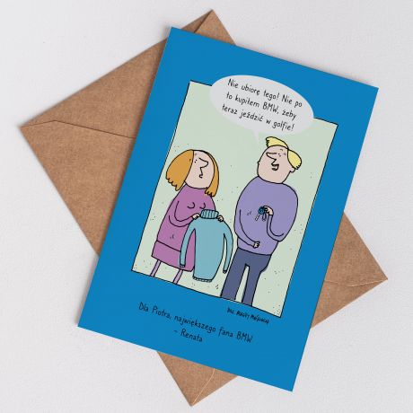 Zabawna kartka dla fana BMW to świetny dodatek do prezentu.