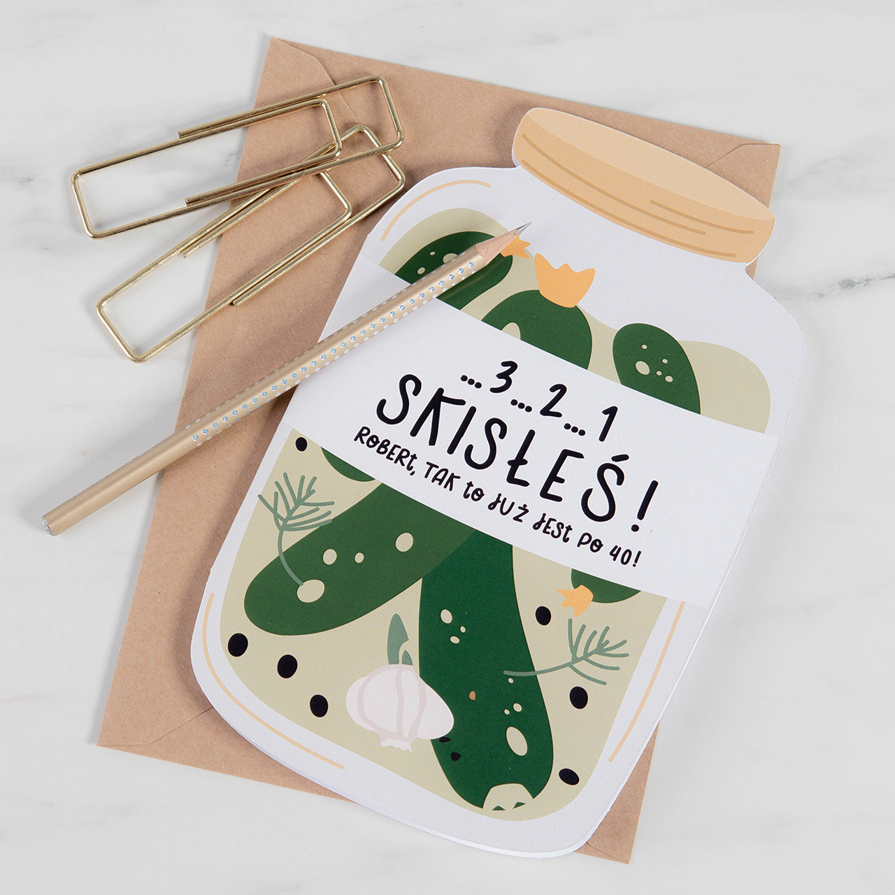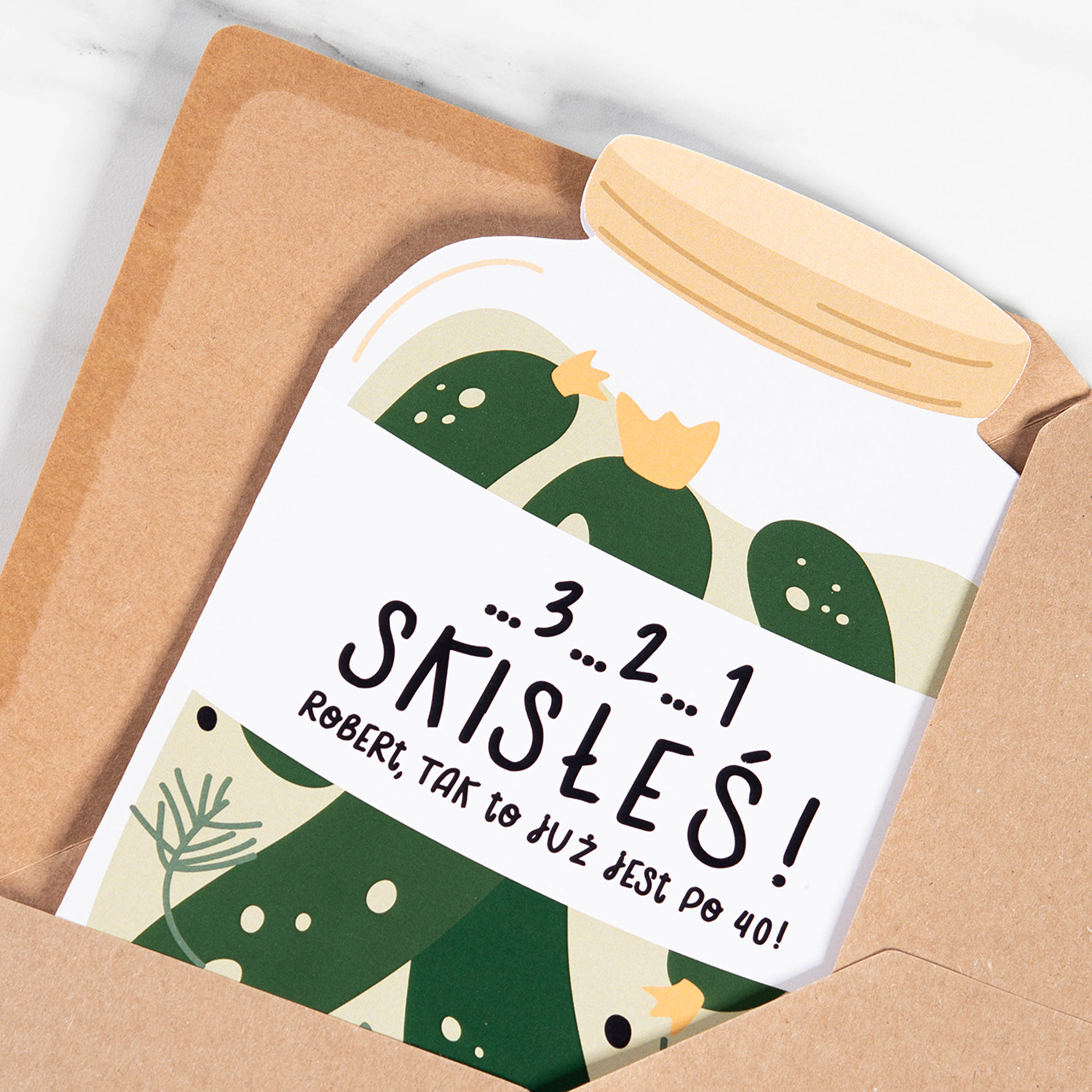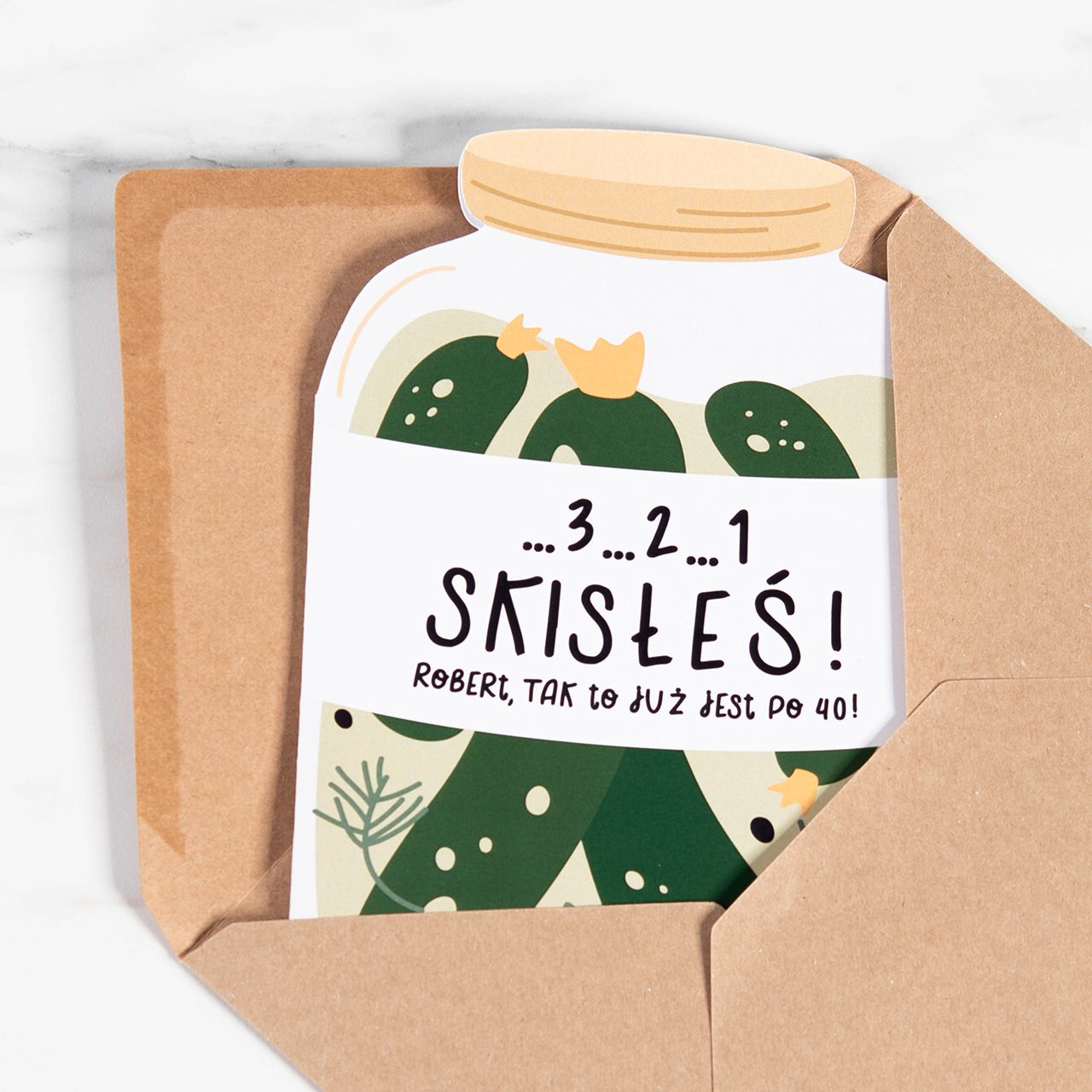 Kiszonki to uwielbiane przez nasz naród przysmaki, dlatego przyrównanie solenizanta do tego stanu jest prawdziwym komplementem. Śmieszna kartka na 40 urodziny dla mężczyzny rozbawi do łez całe towarzystwo. Kartka na drobny prezent na 40 urodziny jest zabawna, pomysłowo zaprojektowana, unikatowa i przede wszystkim swoim przekazem trafia prosto w sedno! Śmieszna kartka na 40 urodziny dla mężczyzny wprawi w cudowny nastrój każdego faceta. Kartka urodzinowa na 40 urodziny to idealny dodatek do głównego prezentu dla brata, przyjaciela, kolegi z pracy, a nawet męża.