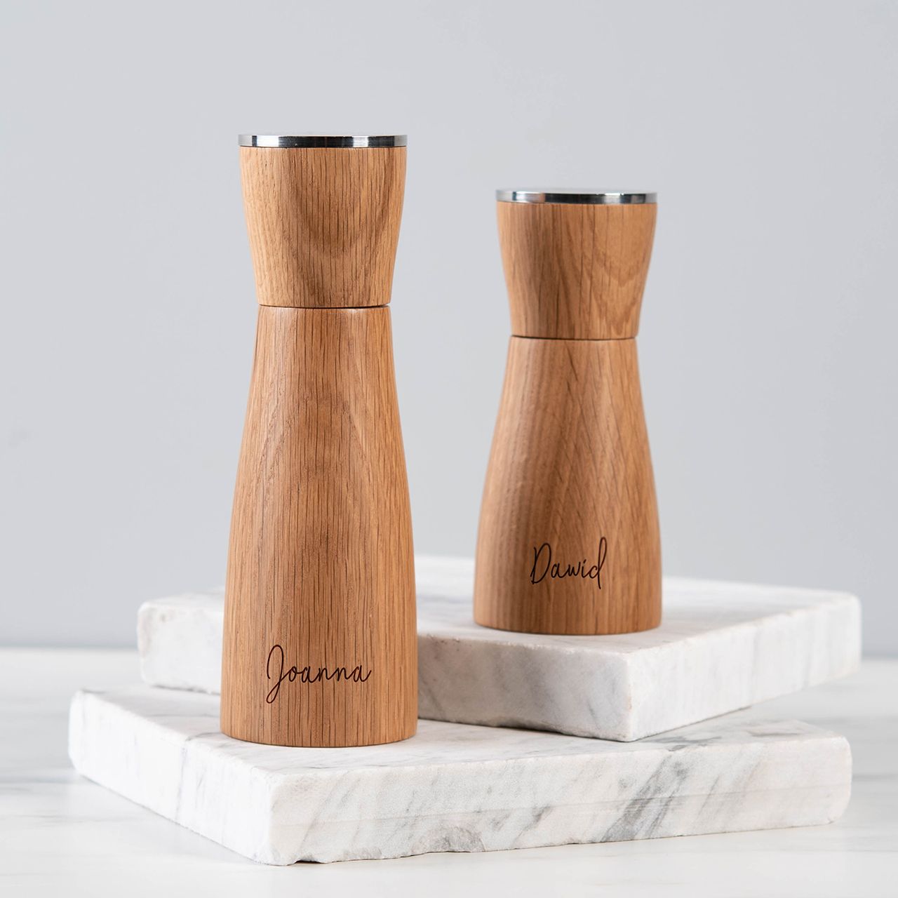 Młynki drewniane do soli i pieprzu z imionami to ciekawy pomysł na praktyczny prezent do kuchni.