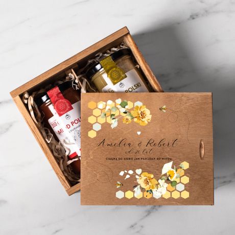 Zestaw polskich miodów w skrzynce to cudowny pomysł na personalizowany prezent na rocznicę ślubu.