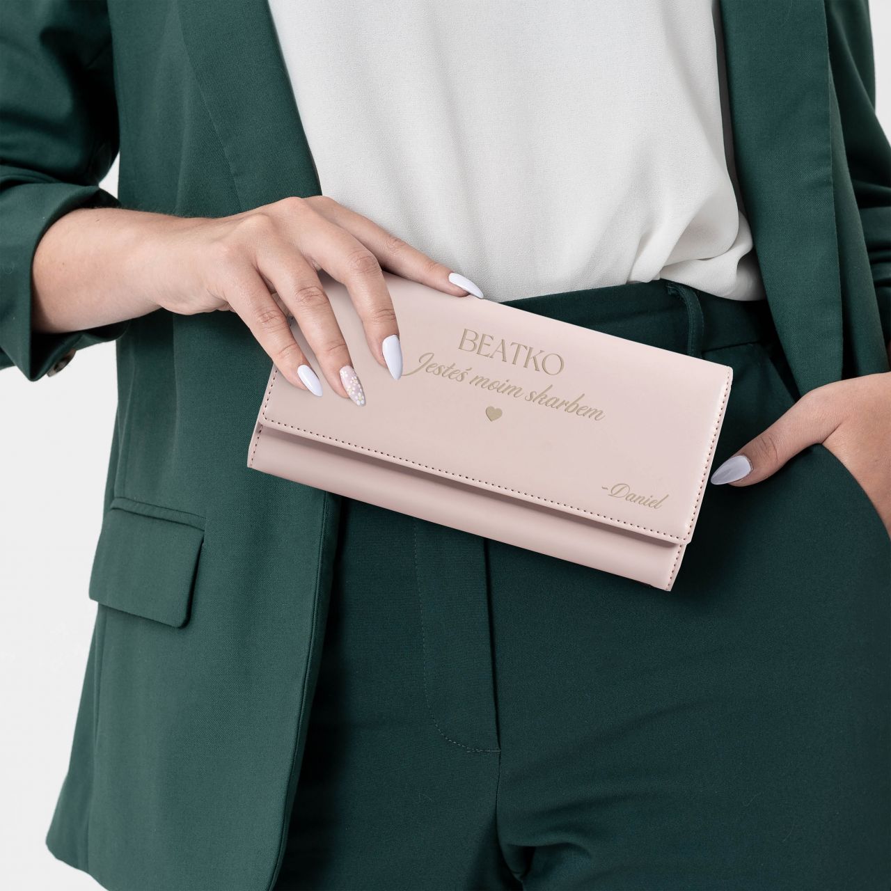 Skórzany portfel dla dziewczyny to harmonijne połączenie funkcjonalności z elegancją przedmiotu upominkowego. Zapinany na wygodny zatrzask zabezpieczający skórzany portfel idealnie pasuje do kobiecej torebki. Tylko spójrz na te misterne wykończenia i detale. Delikatny pudrowy róż pięknie współgra z dedykacją i zamkiem w złotym kolorze. Jeśli twoja sympatia ceni sobie wygodę, szyk i klasę, a przy tym lubi podążać za modą to skórzany portfel dla dziewczyny na pewno skradnie jej serce.