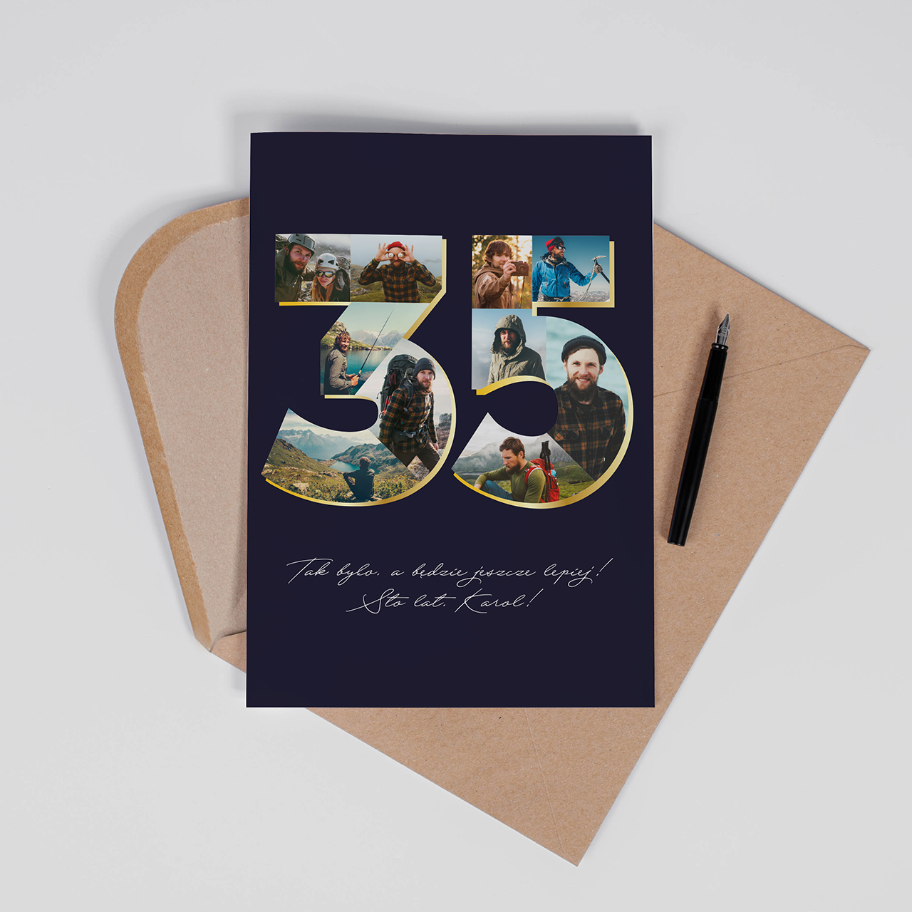 Kartka A4 z okazji 35 urodzin to wyjątkowy sposób na podarowanie bliskiej osobie niezapomnianych chwil i wyjątkowych wspomnień. Na przedniej stronie kartki umieszczona jest duża i wyraźna liczba "35", która wspaniale wprowadza w klimat urodzinowej zabawy, a w niej możesz umieścić kolaż z najpiękniejszymi zdjęciami solenizanta lub wydarzeń, które są dla niego ważne. Pod liczbą znajduje się również miejsce na spersonalizowany tekst, który możesz dowolnie zmodyfikować, dodając miłe słowa dla solenizanta. Wewnątrz kartki znajdziesz dodatkowe miejsce na życzenia, a także na kolejną fotografię, która z pewnością rozgrzeje serce jubilata. Ta kartka A4 ze zdjęciami to nie tylko prezent, ale również wyjątkowa pamiątka, którą osoba obdarowana z pewnością będzie cieszyć się przez wiele lat.