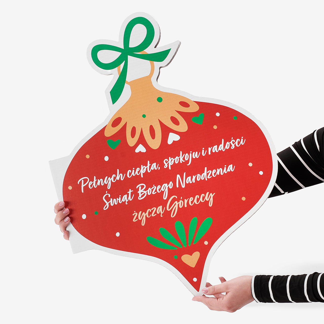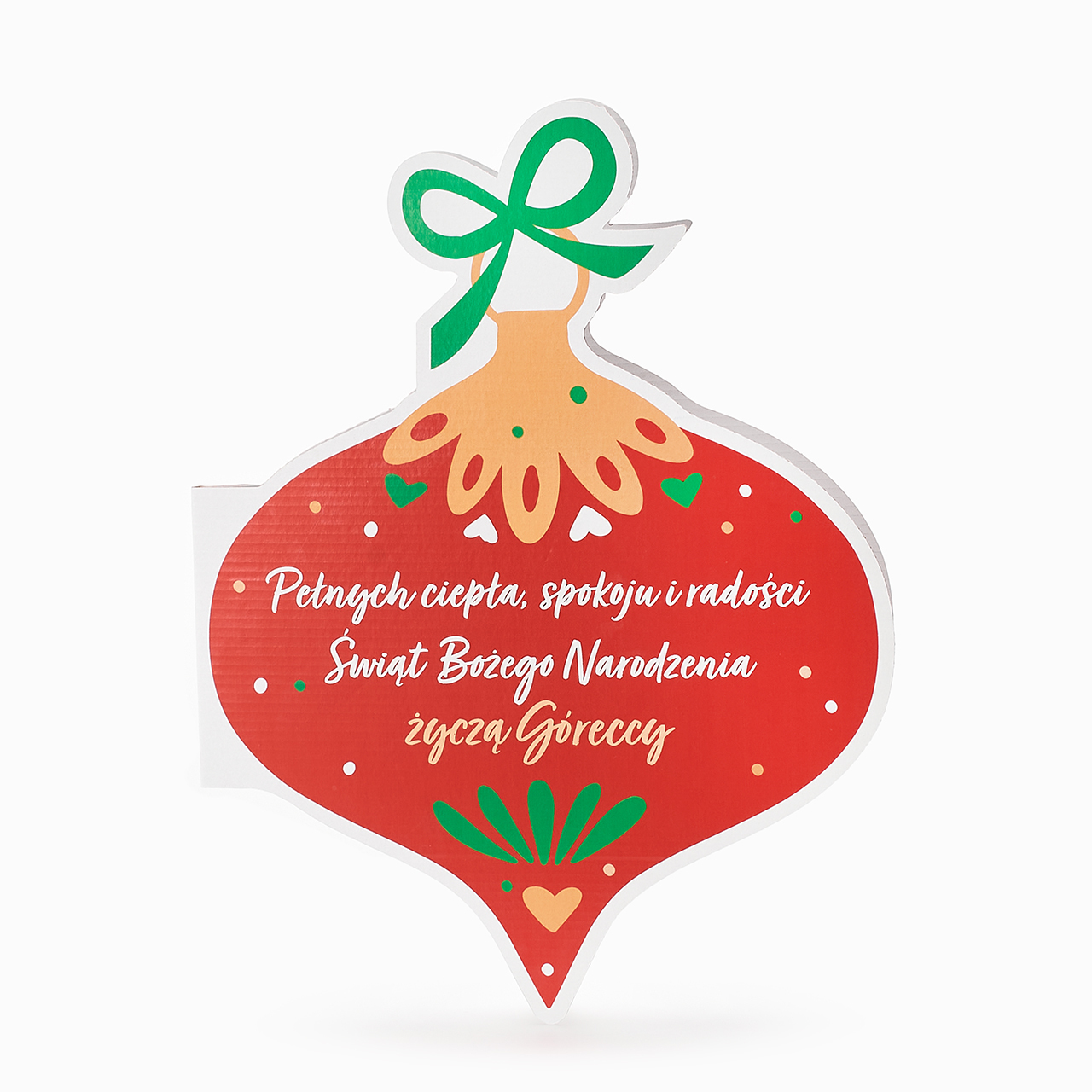 Duża kartka świąteczna w kształcie bombki to idealny prezent dla rodziców, dziadków, wujków czy przyjaciół, którym chcemy sprawić nie tylko radość, ale również zachwyt nad pięknem tradycji bożonarodzeniowej. Niech ta wyjątkowa kartka wprowadzi niepowtarzalny klimat świąt do każdego domu.