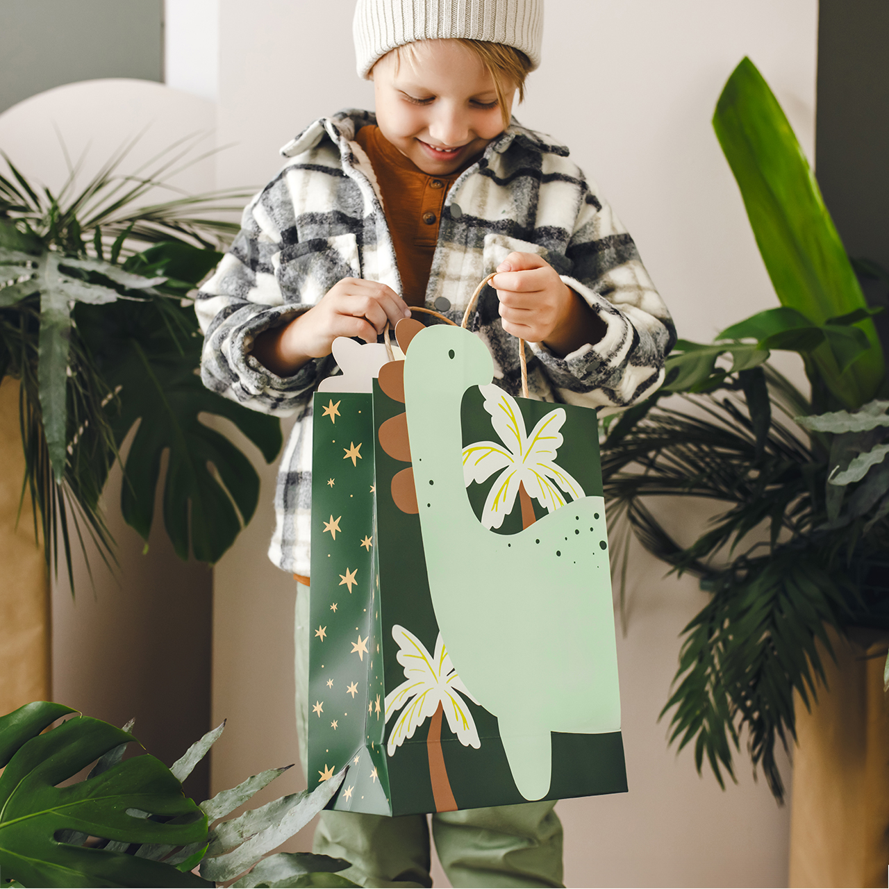 Zachwycająca torebka papierowa na prezent DINOZAUR to doskonałe opakowanie dla miłośników dinozaurów w każdym wieku. Ta kreatywnie wykonana torebka na prezent łączy w sobie funkcjonalność z oryginalnym designem, tworząc niezapomniany sposób prezentacji upominku.