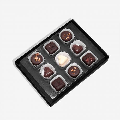 - praliny serca z czekolady deserowej z nadzieniem karmelowym z drobinkami ciasteczek