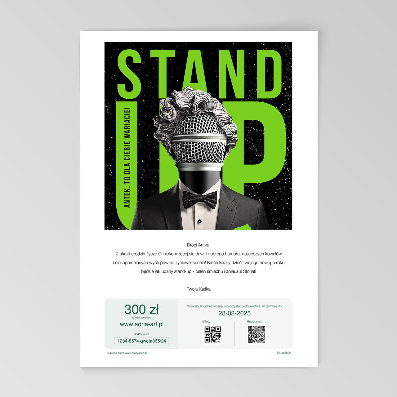 E-voucher na STAND UP o wartości 300 zł to doskonały sposób na obdarowanie bliskiej osoby niecodziennym doświadczeniem. Świetnie sprawdzi się jako prezent na urodziny, imieniny, rocznicę czy dowolną inną okazję.
