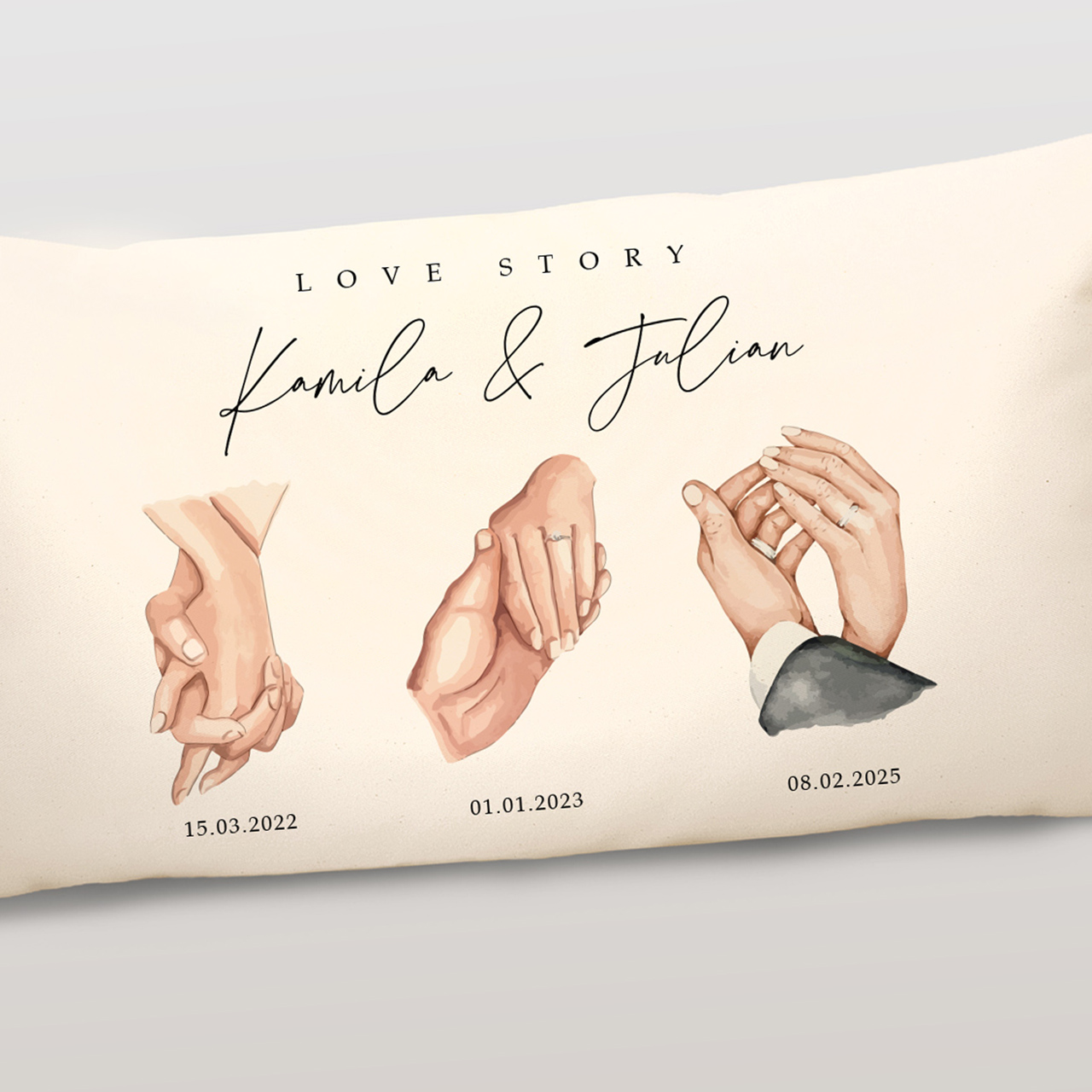 Poduszka na rocznicę ślubu LOVE STORY to wyjątkowy produkt, który stanowi doskonały prezent na rocznicę ślubu. Ta elegancka poduszka na rocznicę ślubu przedstawia splecione dłonie, symbolizujące bliskość, zaufanie oraz wspólne przeżycia, które towarzyszą każdemu związkowi. Pod każdą parą dłoni widnieją daty: rozpoczęcia związku, zaręczyn i ślubu, co nadaje poduszce osobisty i niepowtarzalny charakter.