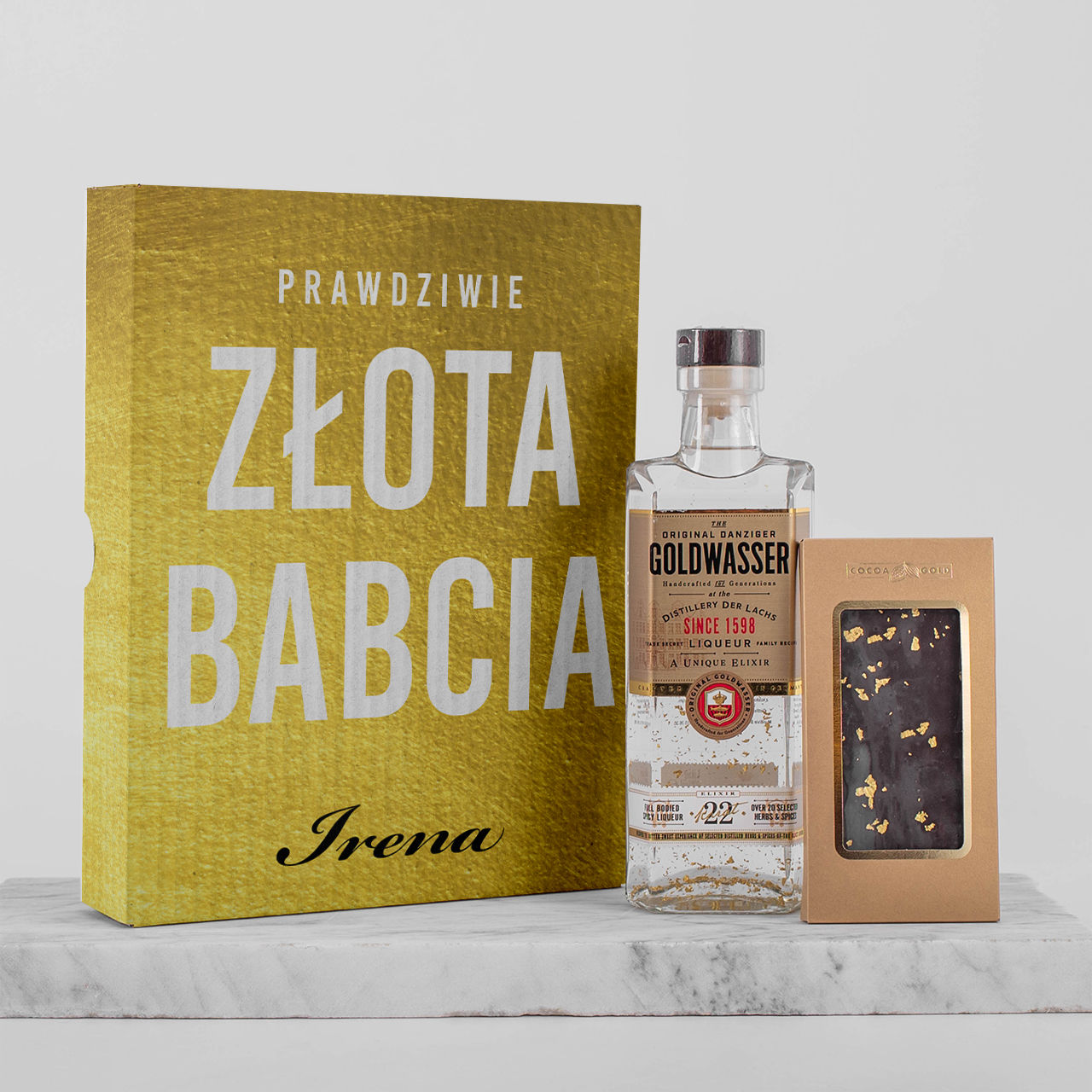 Prezent dla babci personalizowany w zestawie zawiera Likier Goldwasser oraz ciemną czekolada z kawałkami złota. Taka kompozycja, stworzona specjalnie z myślą o wyjątkowych osobach. Dzięki możliwości personalizacji, pudełko może zostać dostosowane do gustu obdarowanej osoby, co tworzy wyjątkowy personalizowany prezent dla babci.