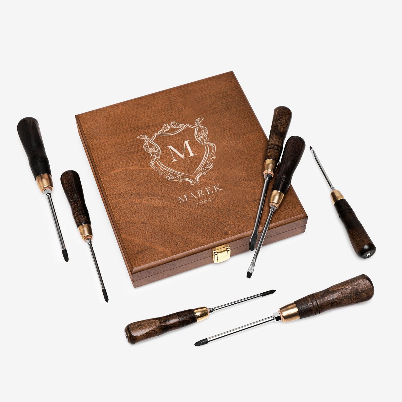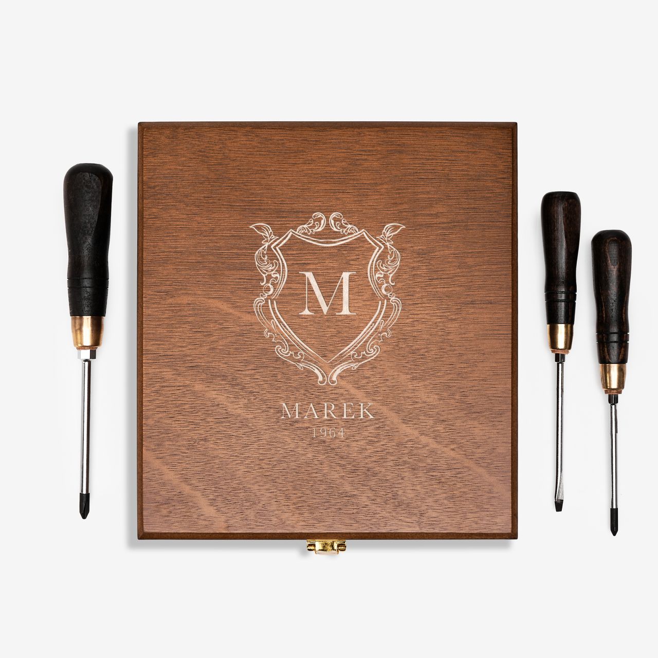 Komplet śrubokrętów w skrzynce to wyjątkowy personalizowany prezent dla dziadka lub prezent na 60 urodziny dla kolegi. Taki prezent dla niego na 60 urodziny będzie nie tylko przydatnym zestawem narzędzi, ale też dzięki grawerowanej skrzynce posłuży jako wyjątkowa pamiątka na półce w miejscu pracy obdarowanej osoby.