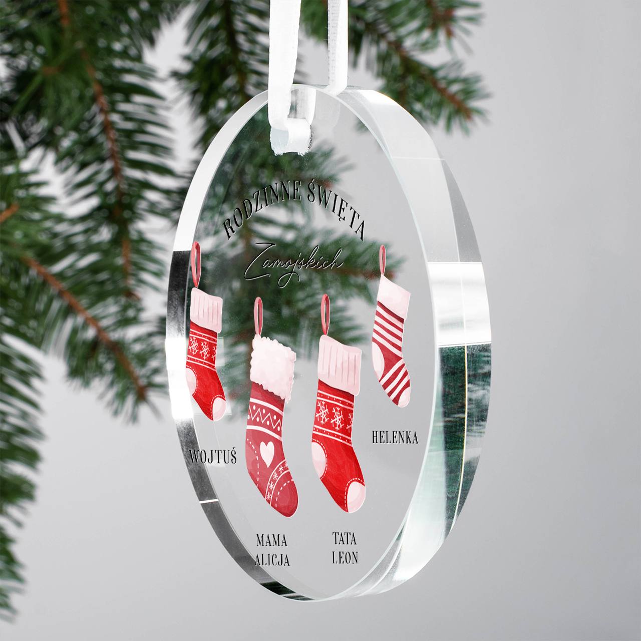 Zawieszka świąteczna RODZINNE ŚWIĘTA to elegancka szklana zawieszka, która pięknie mieni się w świetle lampek choinkowych, tworząc ciepłą i wyjątkową atmosferę. Doskonale sprawdzi się jako zawieszka na choinkę lub subtelny akcent dekoracyjny na świąteczny stół. Dzięki możliwości personalizacji stanie się niezapomnianym symbolem wspólnych chwil.