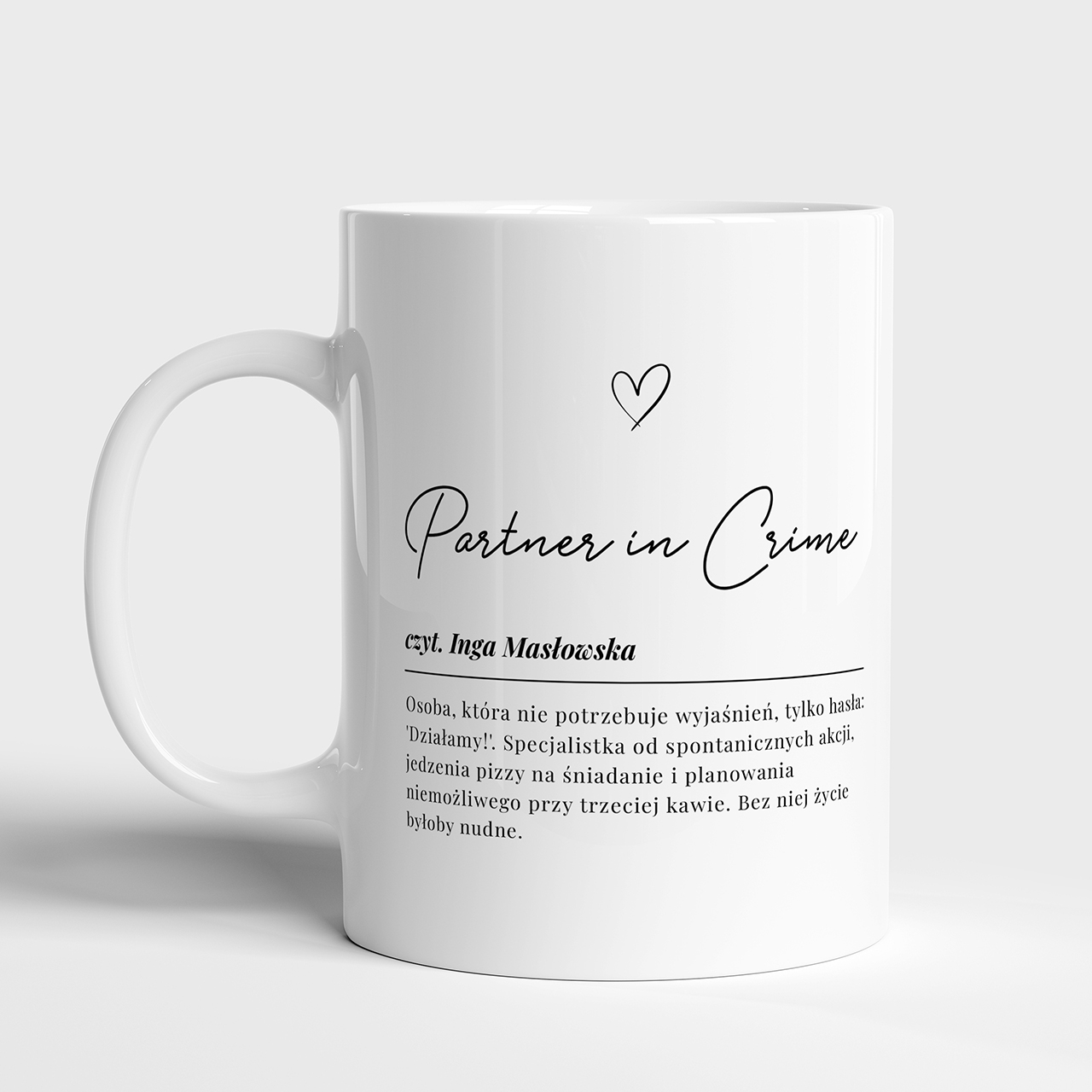 Kubek PARTNER IN CRIME to idealny sposób, aby podkreślić wyjątkową więź między Tobą a Twoją najlepszą przyjaciółką. Ten oryginalny i zabawny kubek dla przyjaciółki sprawi, że każda wspólna kawa czy herbata będzie jeszcze przyjemniejsza. To nie tylko praktyczny dodatek do codziennych rytuałów, ale także symbol Waszej wspólnej historii i niezapomnianych przygód.