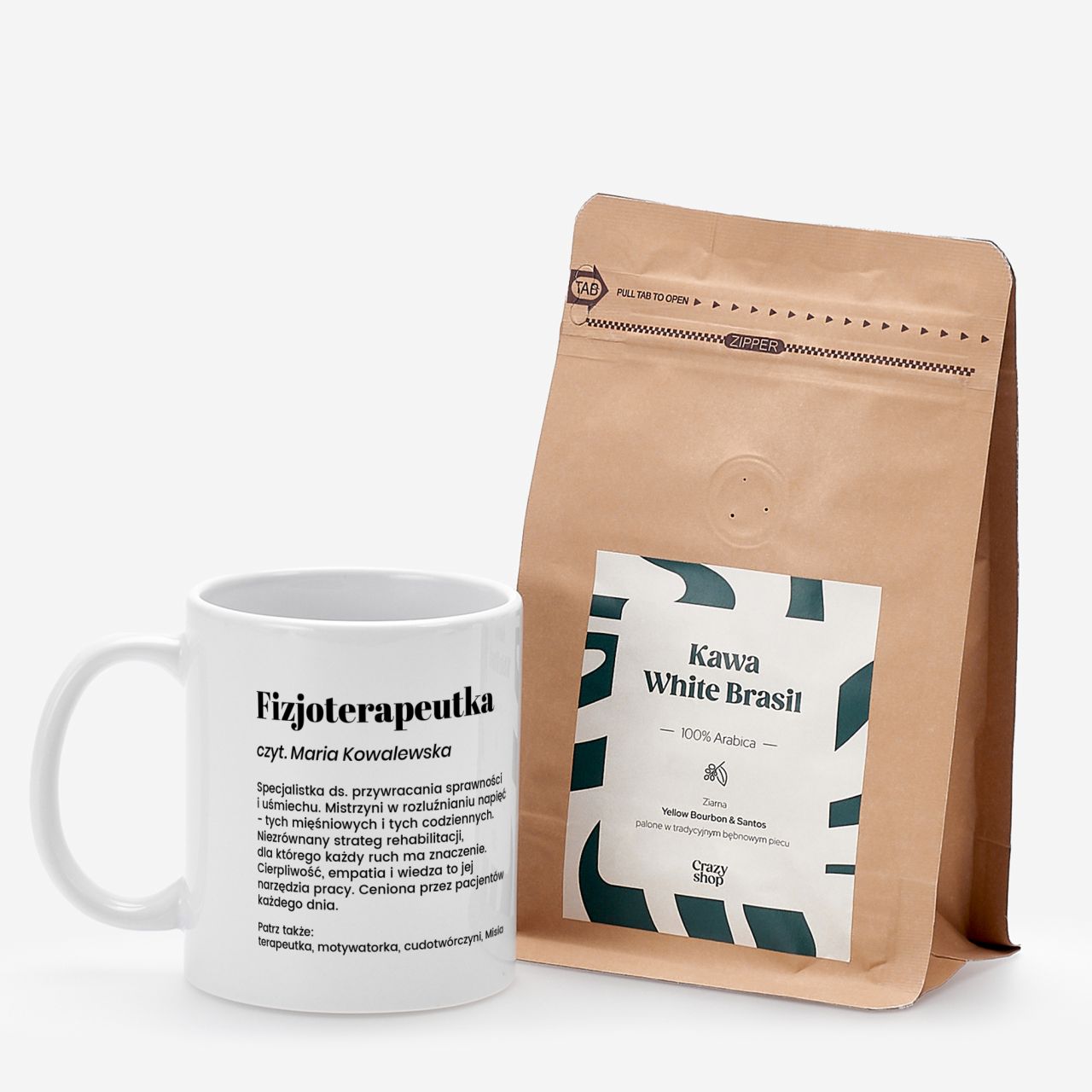 Dzięki uniwersalnemu charakterowi to także doskonały zestaw prezentowy z kawą dla każdego specjalisty z branży zdrowia. Kawa i kubek z nadrukiem DEFINICJA może być wyjątkowym pomysłem na prezent dla masażystki, która dba o relaks i dobre samopoczucie pacjentów, a także świetnym wyborem na prezent dla terapeutki ruchowej, której praca wymaga pełnej koncentracji i zaangażowania. Podaruj chwilę przyjemności w postaci aromatycznej kawy i ulubionego kubka!