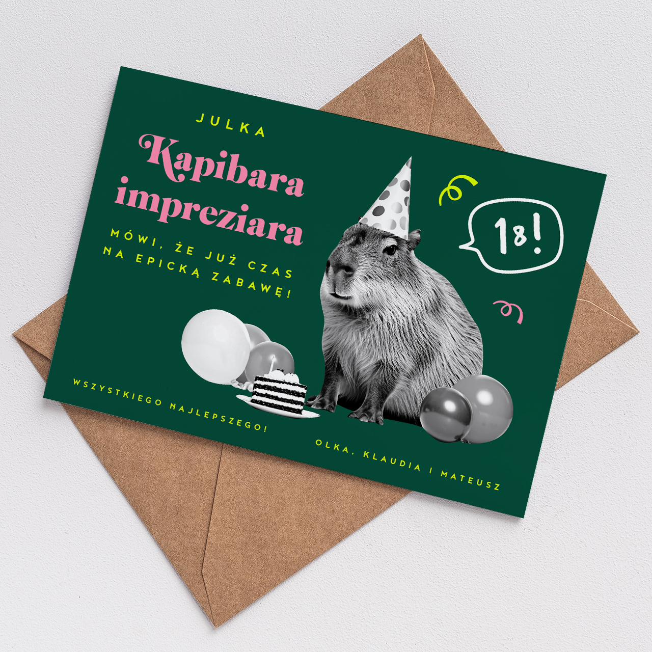 Nie masz pomysłu na śmieszny prezent na 18? Postaw na humor i wybierz tę oryginalną kartkę na osiemnastkę! To świetny dodatek do prezentu, ale równie dobrze sprawdzi się jako samodzielny upominek na osiemnastkę. Śmieszna kartka na 18 urodziny KAPIBARA to idealny wybór na ten wyjątkowy dzień!