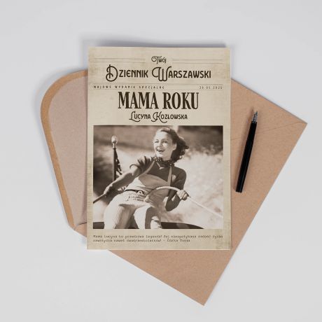 Kartka na Dzień Matki MAMA ROKU A4 to wyjątkowy sposób, by powiedzieć mamie, jak bardzo jest ceniona. Utrzymana w stylu retro, przypomina okładkę gazety i świetnie sprawdzi się jako śmieszna kartka na Dzień Mamy, która jednocześnie wzruszy i rozbawi. To idealny wybór, jeśli szukasz czegoś oryginalnego i chcesz wręczyć niebanalny upominek dla mamy.