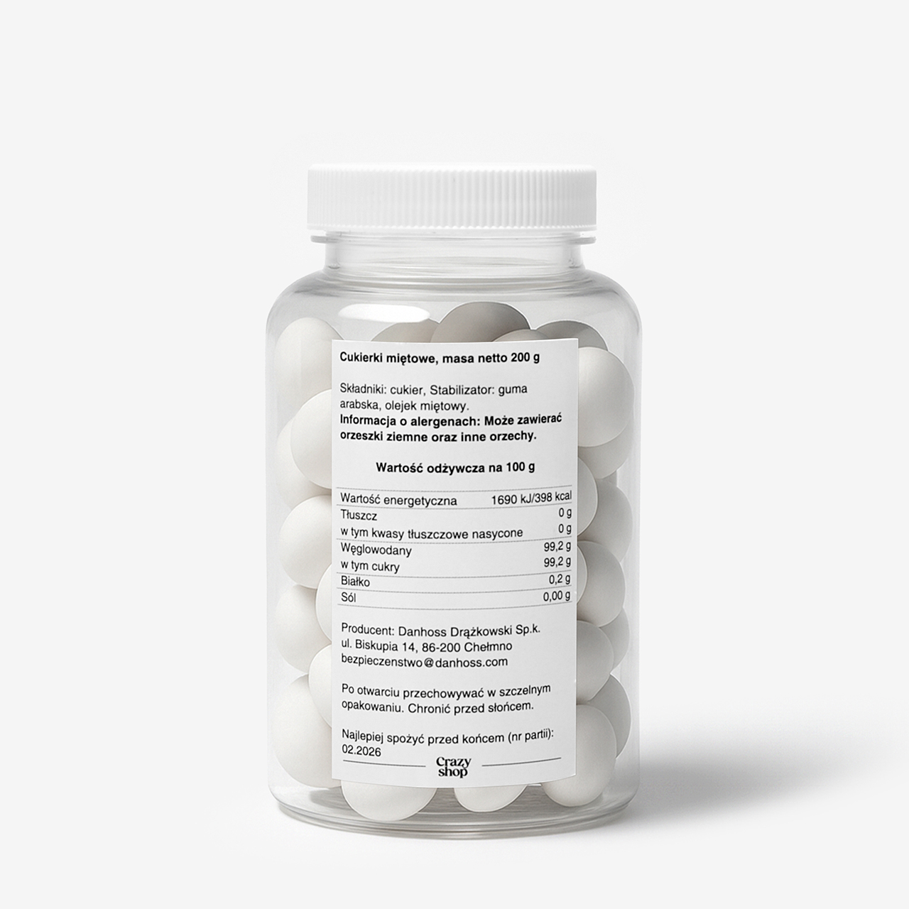 Składniki: cukier, stabilizator: guma arabska, olejek miętowy