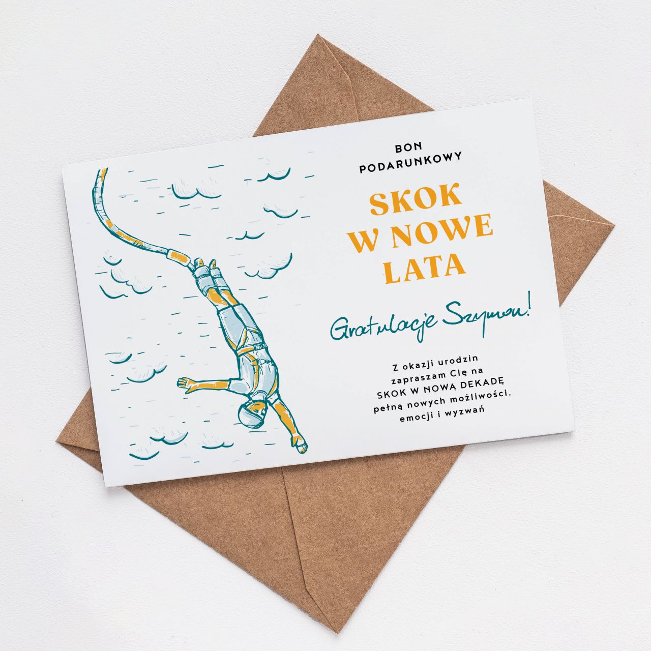 Kartka urodzinowa BON NA SKOK NA BUNGEE to oryginalna forma zaproszenia do przeżycia niezapomnianych emocji. To świetny wybór na urodziny - zwłaszcza te okrągłe, symbolizujące wejście w nowy etap życia.
